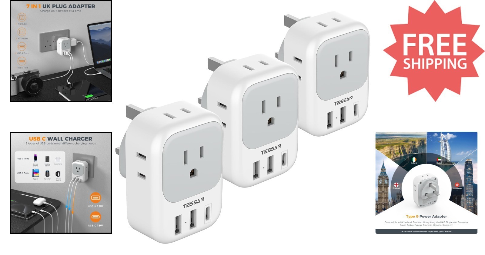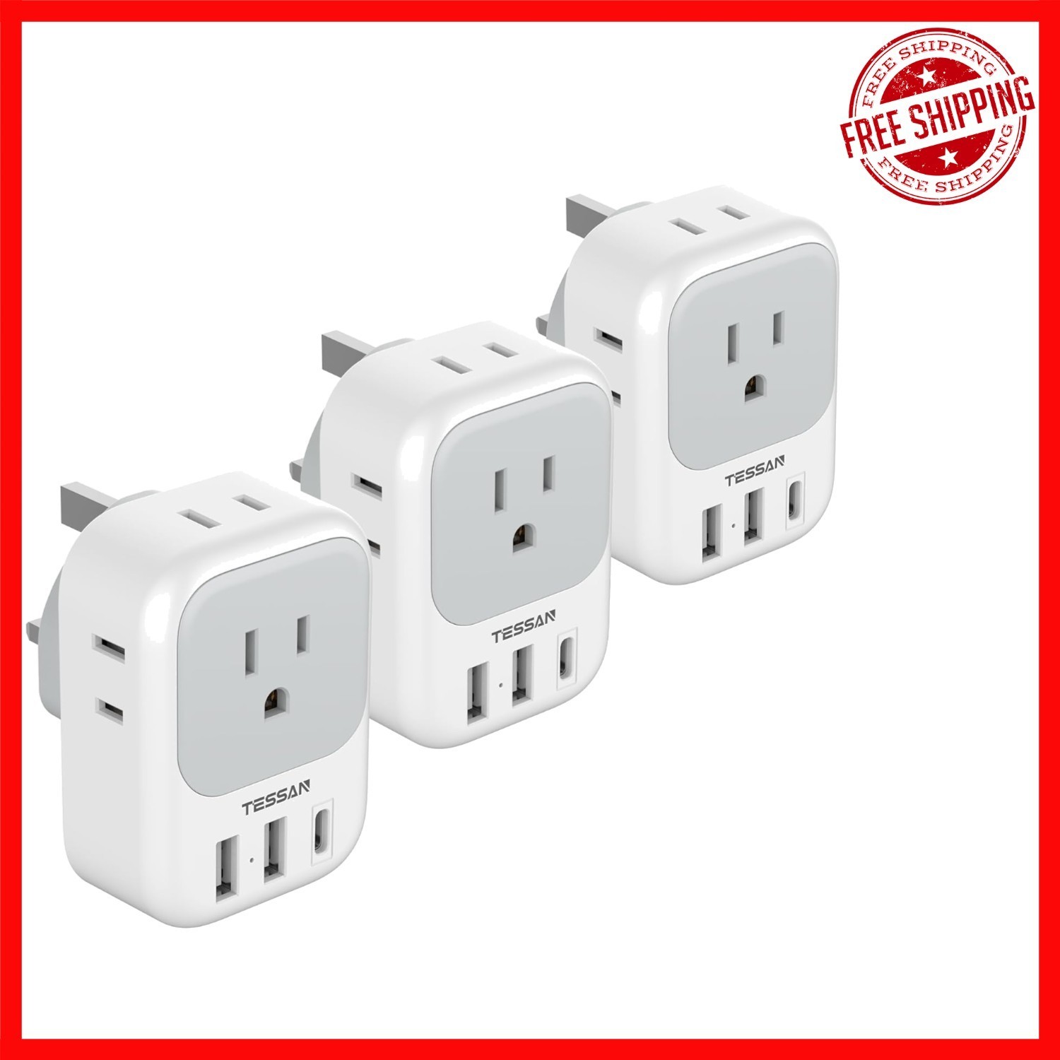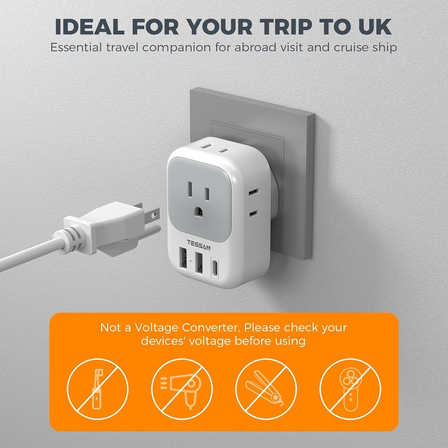 Transform a single UK Type G socket into 4 American outlets and 3 USB ports with this 7-in-1 UK Power Adapter. Perfect for travelers, professionals, and students, it allows you to charge up to 7 devices simultaneously without blocking outlets, making it ideal for airports, hotels, and dorm rooms.