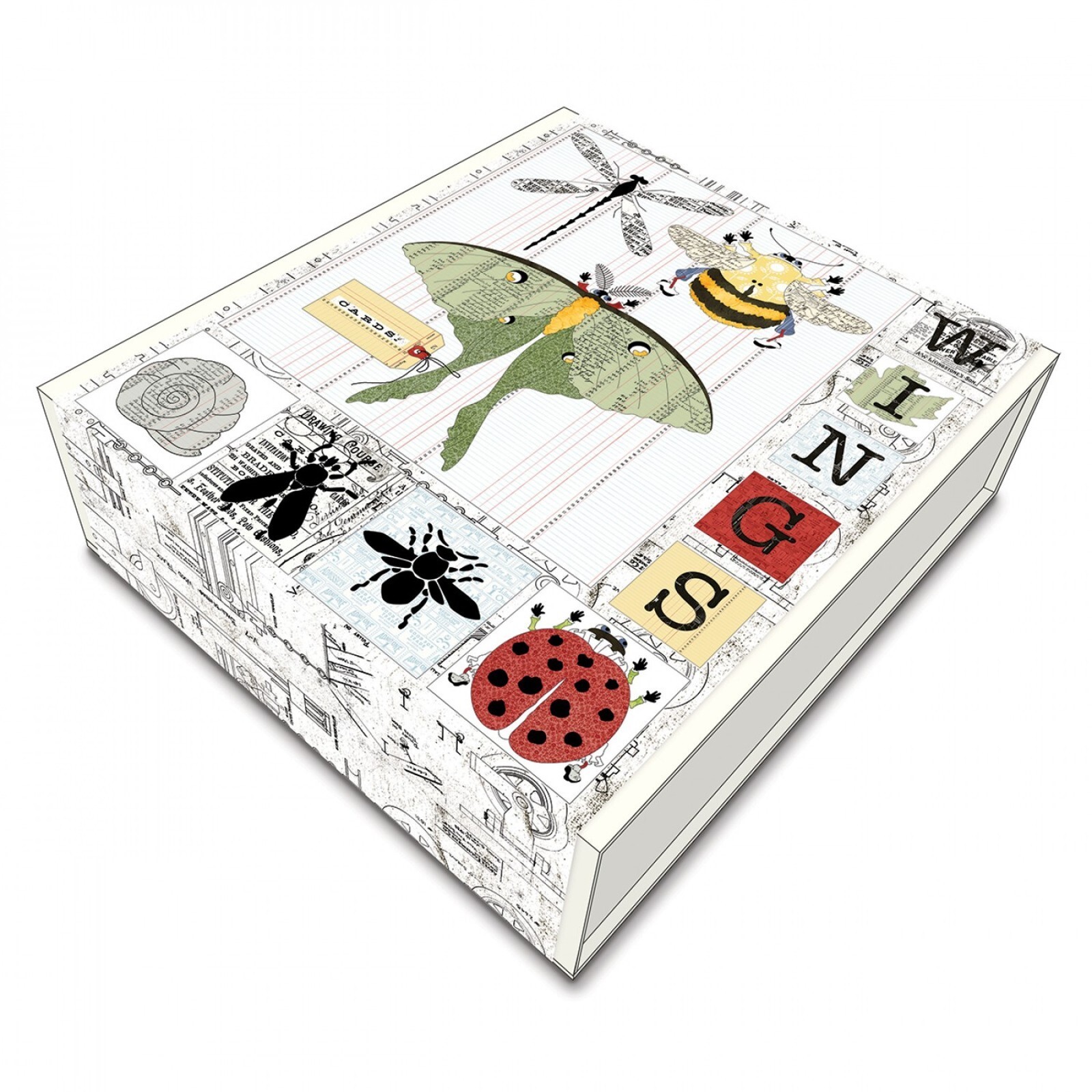 Completed, the wings on the moth and lady bug lift up to reveal another layer of print and pattern?a true art journaling technique. Create applique bug stamps with the Bug Post print and store them in delightful moth, lady bug, and tag pockets.