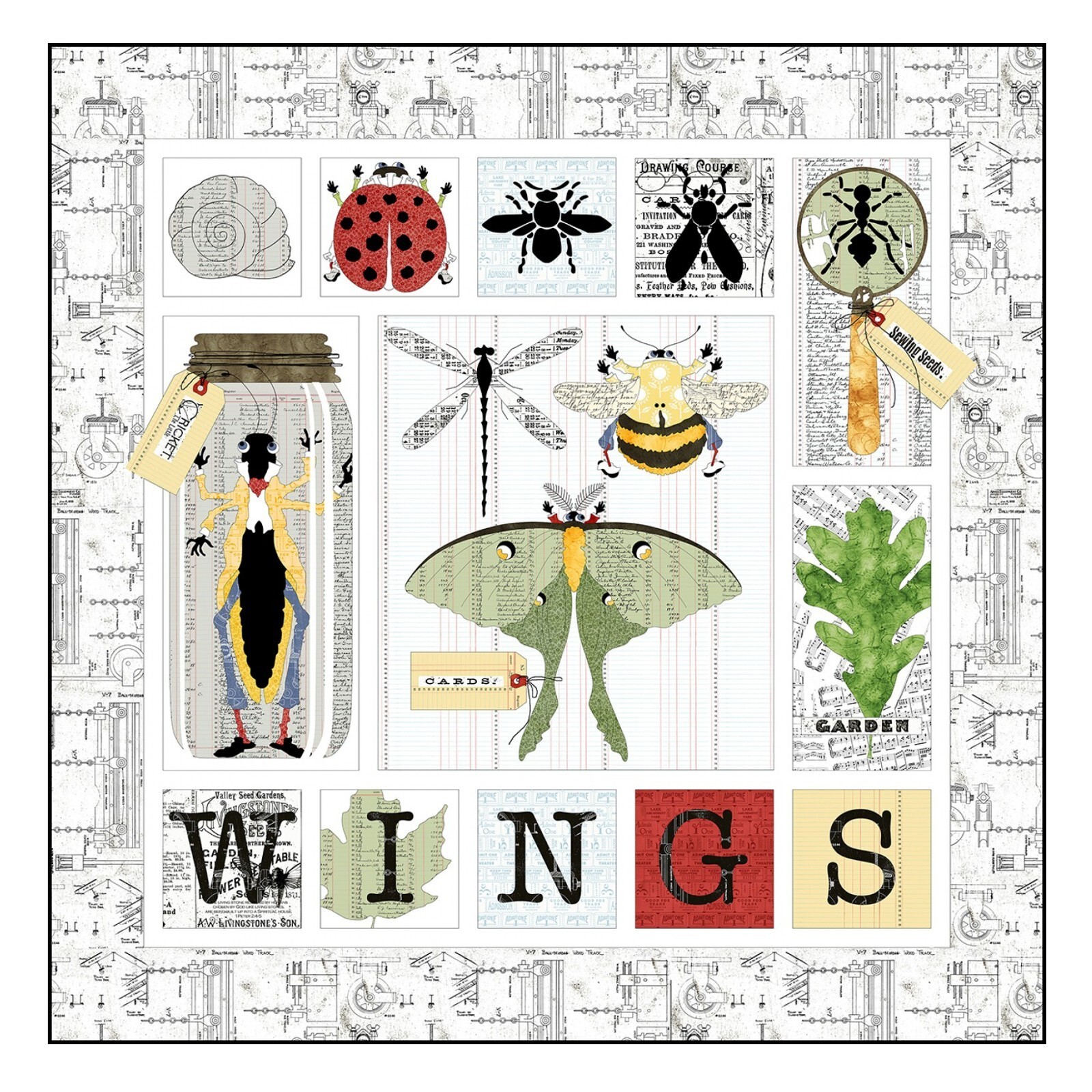 Riley Blake Designs Art Journal In The Wings Activity Quilt Kit KT-13030. The In the Wings Activity Quilt Boxed Kit includes pattern and fabric for quilt top and binding. Backing not included. Fabric featured is Art Journal by J. Wecker Frisch. Pattern is also by J. Wecker Frisch. The simple game of matching, layered with the three-dimensional piecing of this pattern, will spark creativity and imagination as your loved ones explore the world of these magical and handsome winged insects. Completed, the wings on the moth and lady bug lift up to reveal another layer of print and pattern?a true art journaling technique. Create applique bug stamps with the Bug Post print and store them in delightful moth, lady bug, and tag pockets. Quilt Kit Includes: The quilt pattern and fabric for quilt