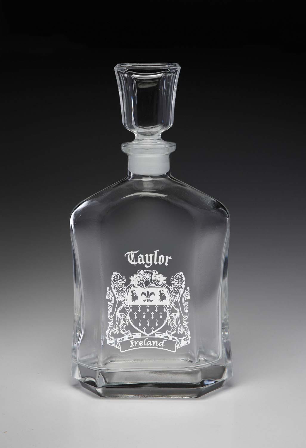 Taylor Whiskey Decanter with Irish Coat of Arms - (Sand Etched). The classic and timeless design of this liquor decanter makes the perfect gift. The Irish Rose Gifts can etch over 1000 Irish family names and authentic coats of arms on this beautiful liquor decanter. A perfect wedding, groomsman, reunion, any-occasion gift. Authentic Irish coat of arm. Over 25 years of Heraldry Research. Heavy liquor glass decanter. Glass stopper with polyethylene under cap. 23.75oz capacity 5.25"Dx10.75". High quality permanent sand-etching.