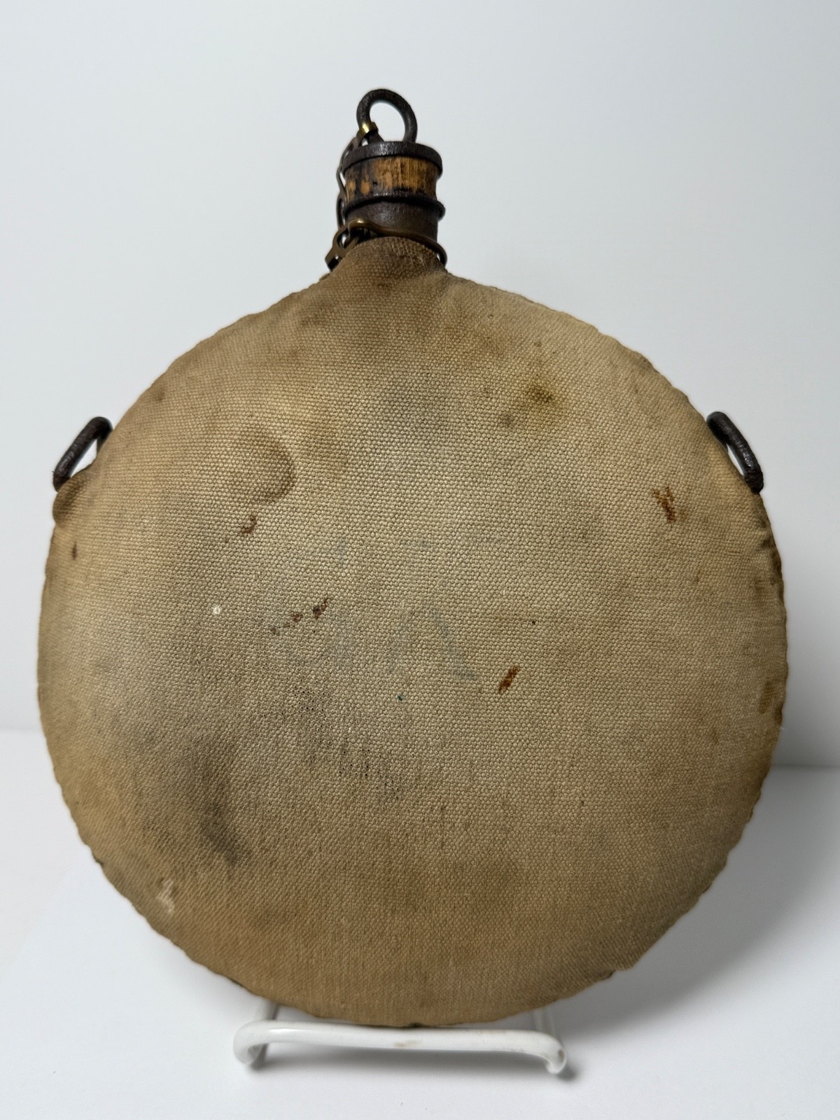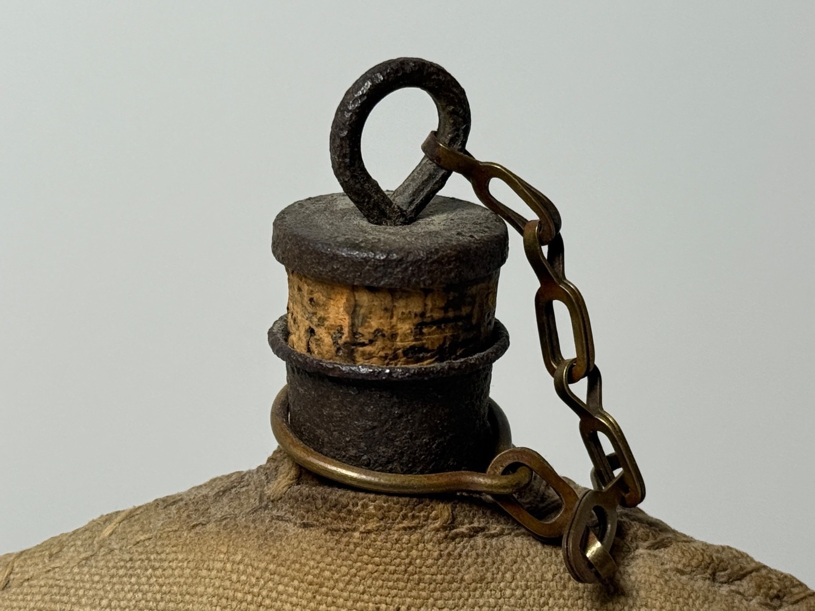 Two steel triangle shaped rings on each side of the canteen are intact. The original cork is in full form. Stopper retaining chain is intact. This pattern of canteen continued in use well into the twentieth century. Used between 1878-1902.