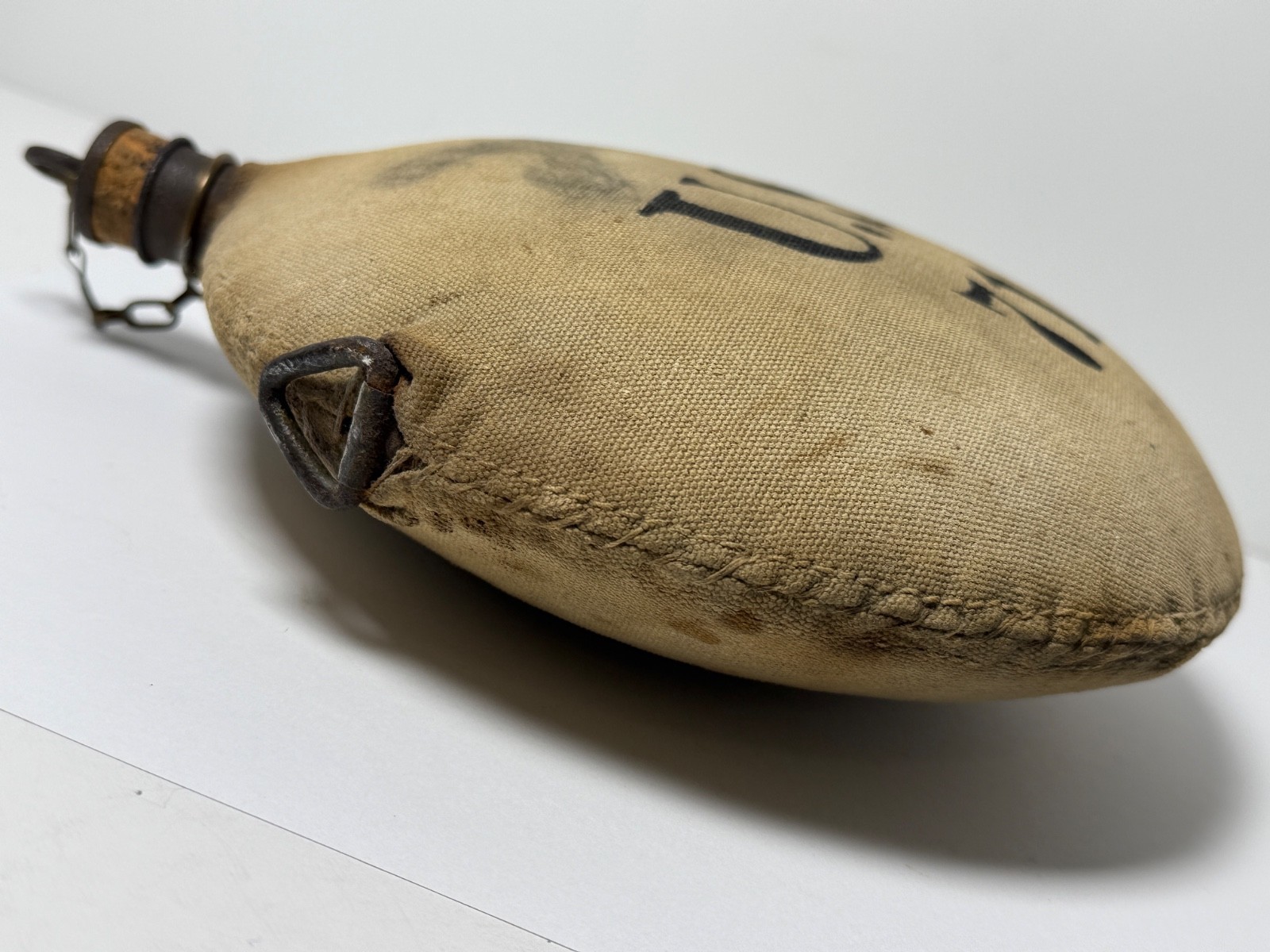 U.S. Military M1878 Canteen. The canvas cover is stenciled "U.S." on the front and stenciled with crossed sabers above the U.S. The number "71" is stenciled below the ?U.S.? All stitching is intact. Some stains due to age and use. Take note of the periods after the U.S. which indicates that this was a latter production.