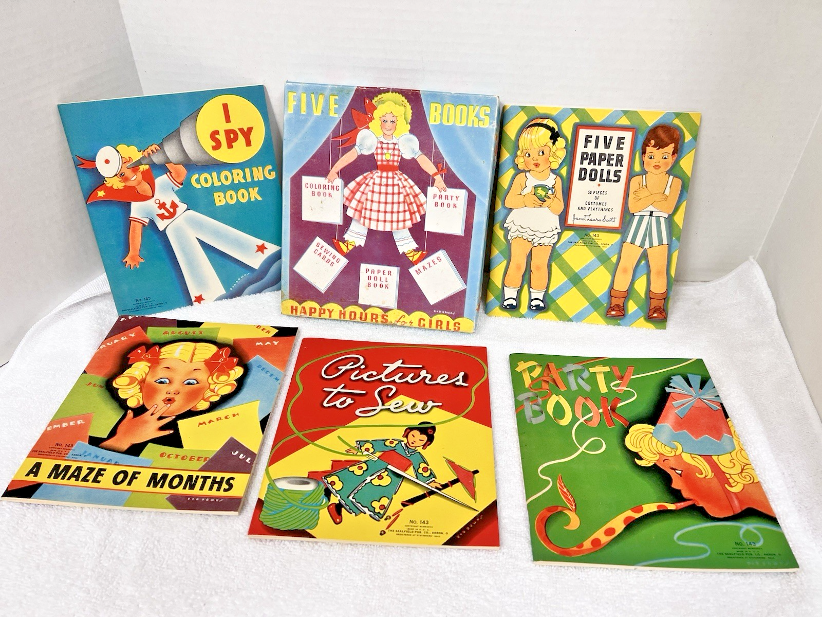 1937 Boxed Set of 5 Books Happy Hours For Girls Paper Dolls Sewing Cards More The outer box is worn and has discoloring/tear type wears the books have not been used and are in great shape so fun!!