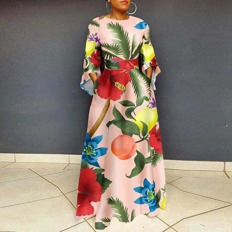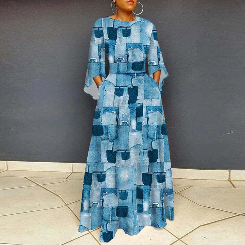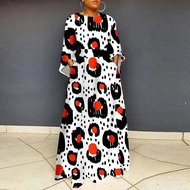 This vintage-inspired plus size maxi dress features a timeless leopard print and an elegant O-neck design. Crafted from non-stretch polyester, it offers a loose, comfortable fit with an empire waistline and an A-line silhouette that gracefully falls to the ankle. Designed for autumn and winter, its 3/4 sleeves provide subtle coverage while maintaining a refined look. Perfect for women seeking a sophisticated yet relaxed style, this dress combines classic charm with effortless comfort.