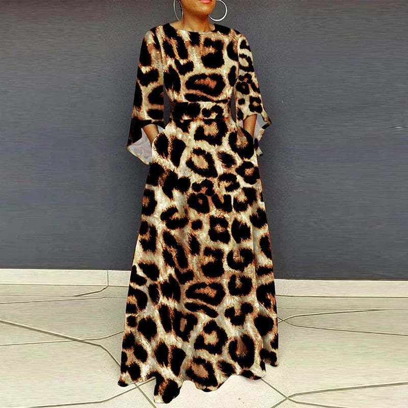 Vintage Plus Size O Neck 3/4 Sleeve Leopard Print Maxi Dress
