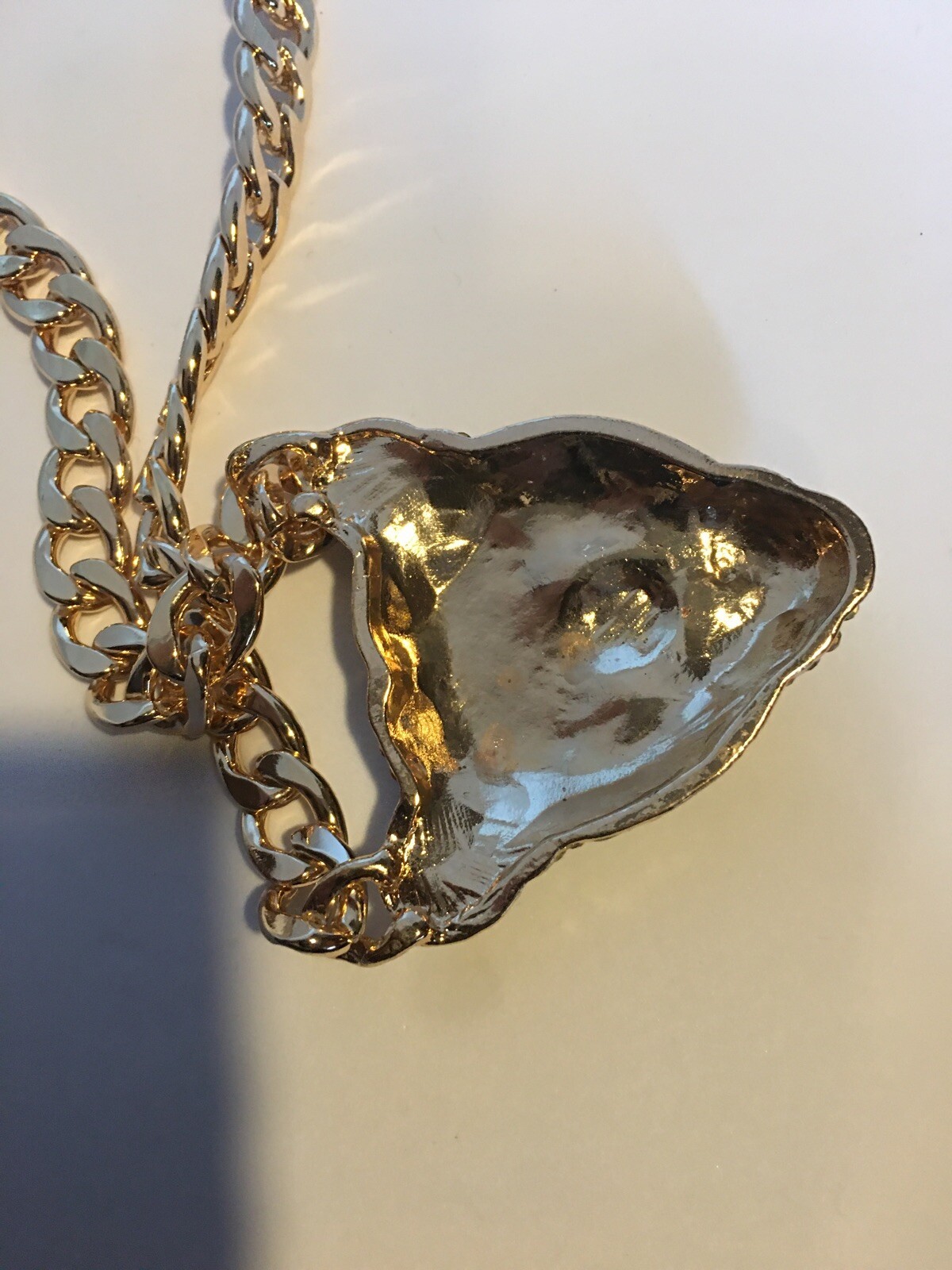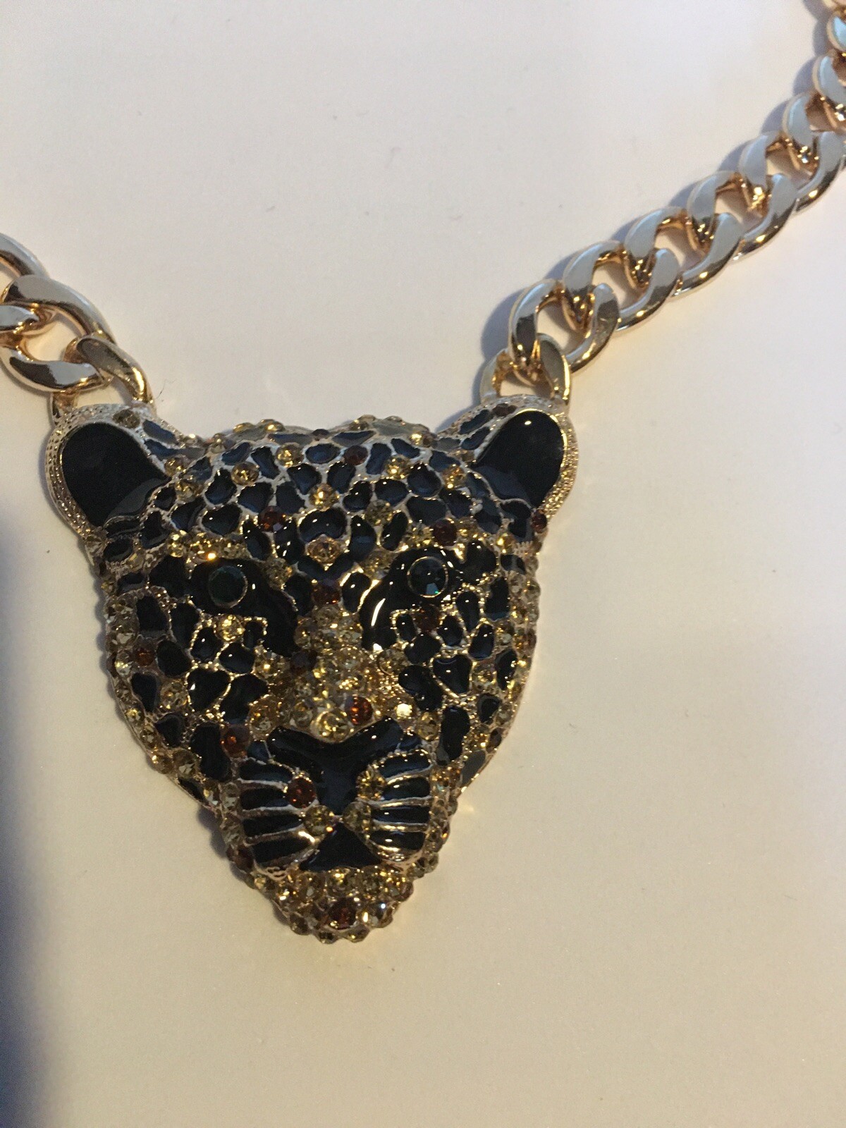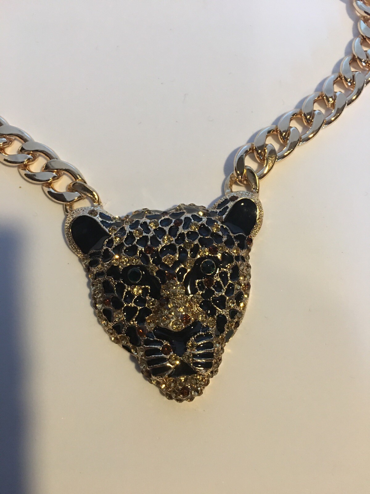 Natasha Black Panther Jaguar Leopard Crystal Gold Tone Head Statement Necklace