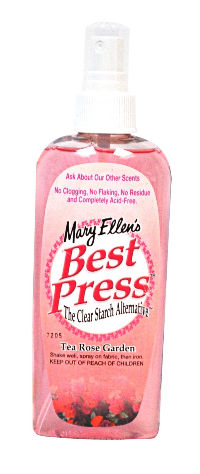 Best Press Clear Starch Alternative Tea Rose Garden. With Best Press, there?s no flaking, clogging, or white residue on dark fabrics. A special stain shield protects fabrics, and the product helps resist wrinkles. Best of all, it?s more effective than any starch you?ve ever used. Try Best Press today- you will never go back to ironing with spray starch! It?s in a non-aerosol clear bottle, so it?s environmentally friendly and you can see how much is left, too. 6 FL OZ. - with pump spray. Manufacturer Part No.: 560036 CHK-80057TeaRose