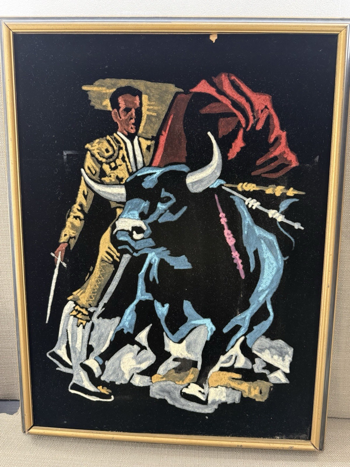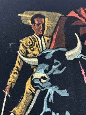 3583. Vintage 1970s Mexican Velvet Painting ? Matador Bullfight Scene 26? x 20?