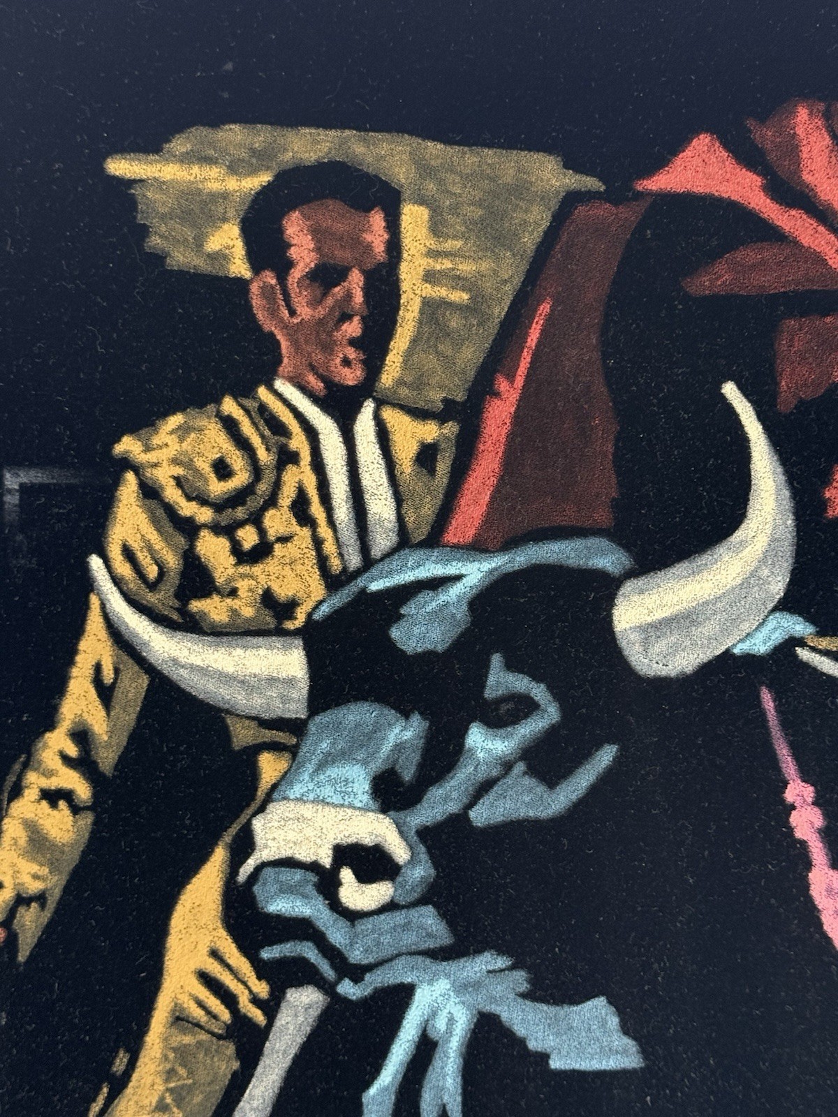 Bold and dramatic vintage black velvet painting depicting a matador and bull mid-fight, rendered in vivid shades of red, gold, and turquoise blue. This striking piece captures the energy and artistry of traditional Mexican bullfighting art from the 1970s, painted on rich black velvet that enhances the color contrast.