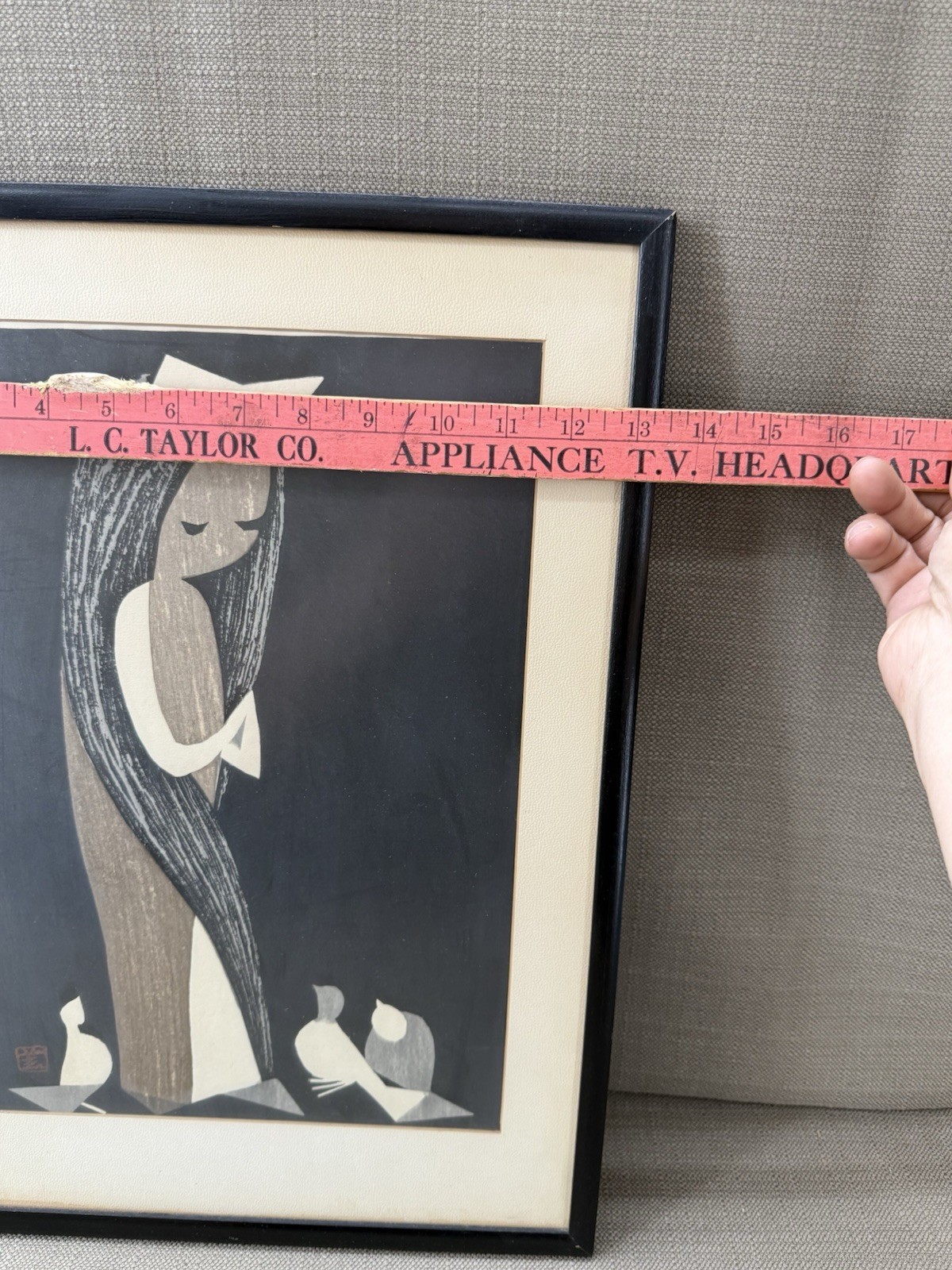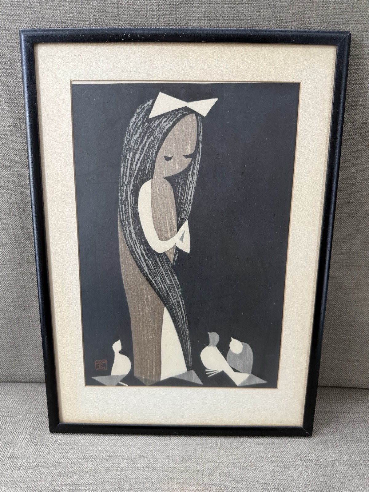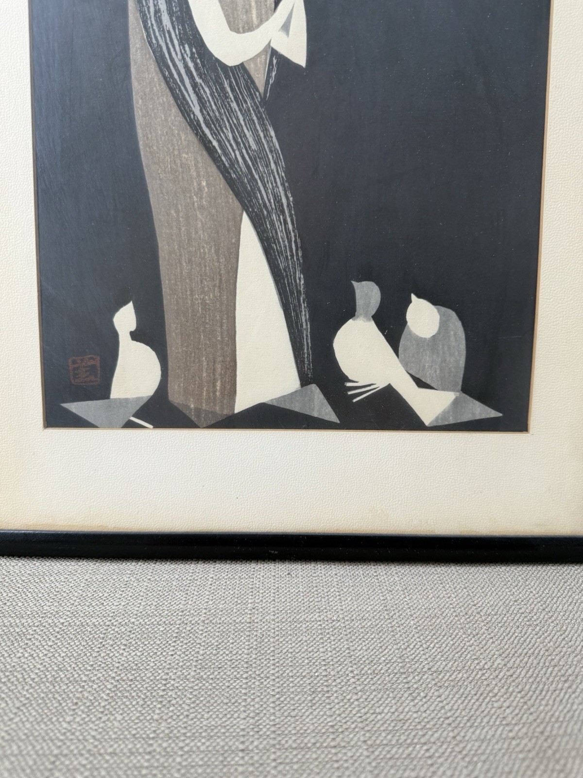 3666. Kaoru Kawano Woodblock Print ? ?Girl with Doves? ? Mid Century Modern Japanese Signed Art