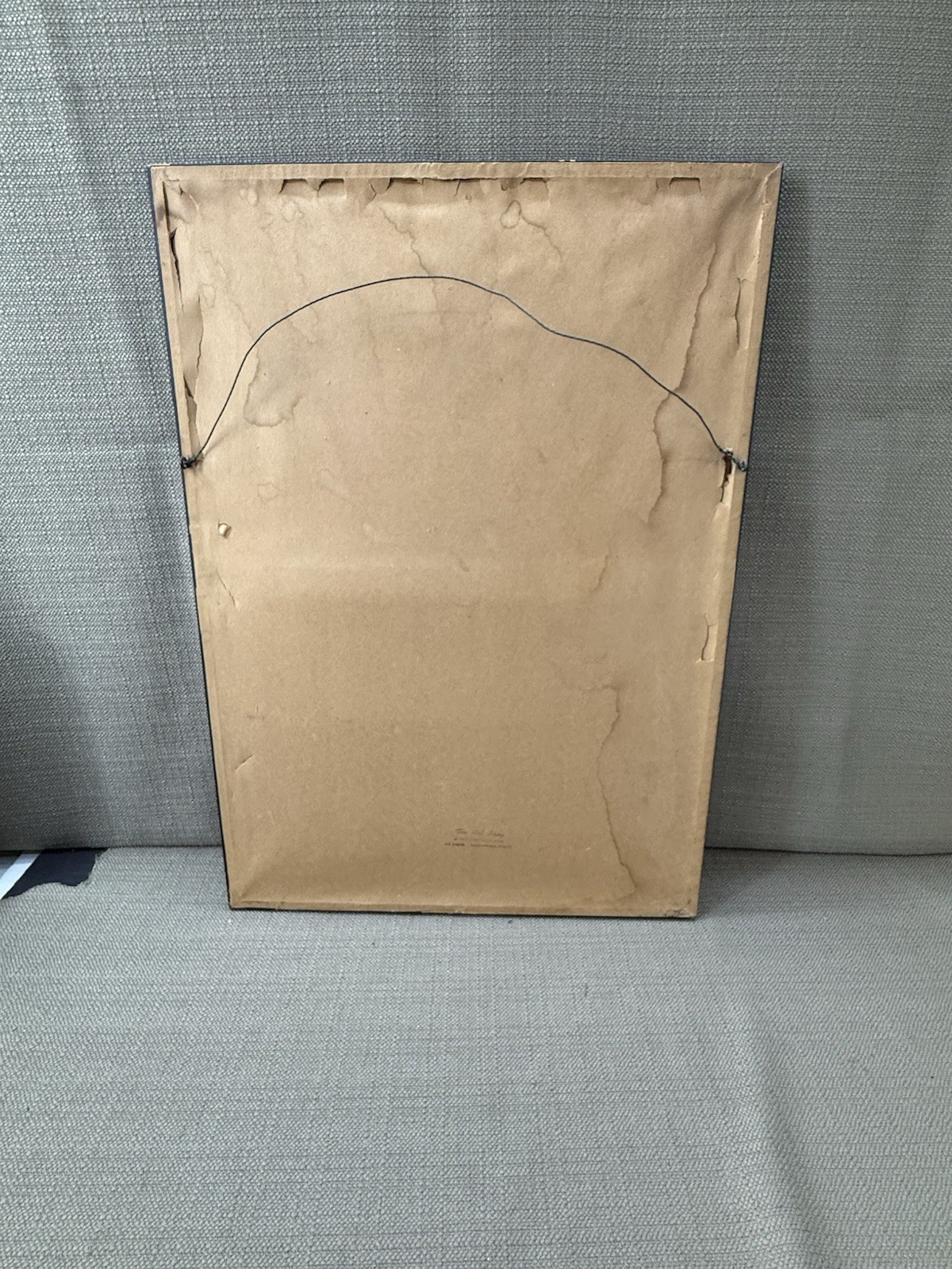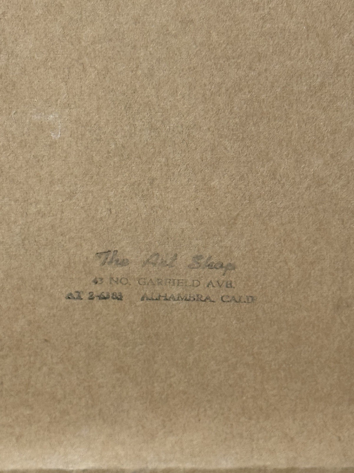 Depicts a young girl with long hair and a bow, surrounded by white doves in a minimalist, contemplative scene. Artist?s red seal visible in the lower left corner. Professionally framed and matted, measuring approximately 18? x 14?. The back retains a label from The Art Shop, Alhambra, California, indicating mid-century U.S. gallery distribution.