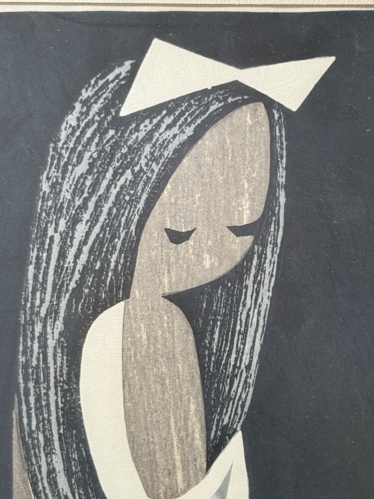 Elegant and serene vintage Japanese woodblock print by Kaoru Kawano (1916?1965) titled Girl with Doves. This signed print features Kawano?s signature style?gentle abstraction, muted tones, and delicate textures that blend traditional Japanese technique with mid-century modern design sensibility.