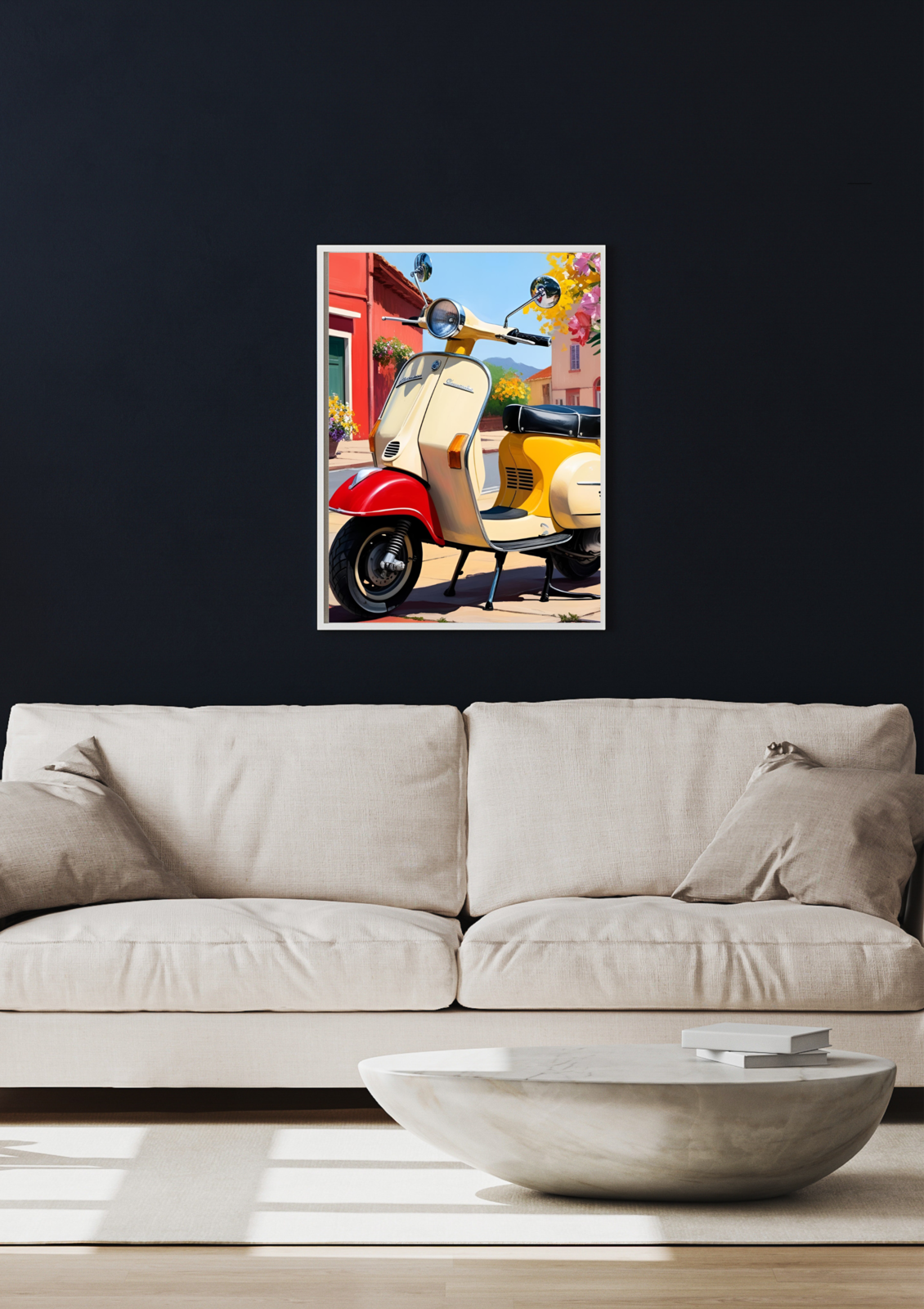 It features a scooter, donning varied shades of yellow and red. The overall atmosphere evokes a feeling of peace and sense of enjoyment. By the way everything is presented, it conveys a message of embarking on a beautiful and marvelous journey, giving this a piece of a more fitting title. The use of a scooter in this scenario also offers a small detail of being simple. They are usually easy to use and have a user-friendly design. With its typically slow speed, the riders will surely savor every moment of their trip more, arriving to the conclusion that their experience is truly a golden journey.