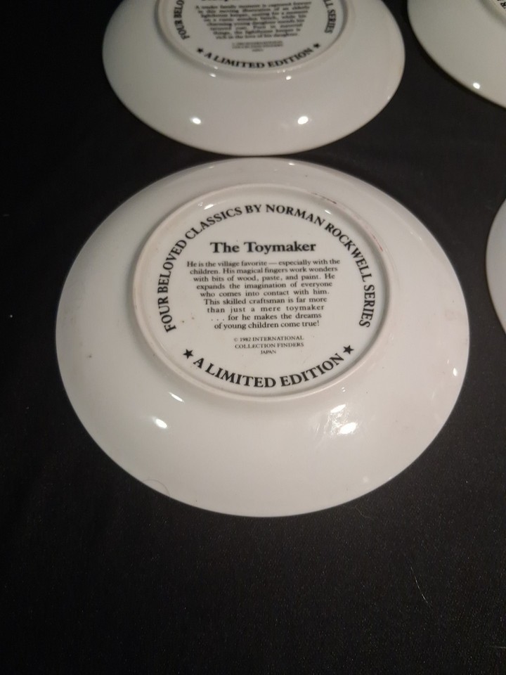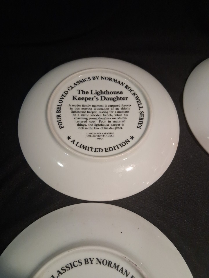 This set of 4 vintage Norman Rockwell "Four Beloved Classics" collector series plates originates from California and features a round shape with a diameter of 6.5 inches. Made of porcelain, these multicolor plates showcase the iconic artwork of Norman Rockwell, representing American culture from the late 20th century. Each plate is a unique piece of art pottery, manufactured in Japan during the 1980s, making them a cherished addition to any collector's display.