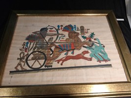 This product is a vintage Egyptian art painting depicting a pharaoh on papyrus paper, framed for display. The artwork captures the rich culture and history of ancient Egypt, making it a unique and collectible piece for those interested in Egyptian artifacts and artwork. The detailed craftsmanship and authentic representation of Egyptian culture make this painting a valuable addition to any collection.