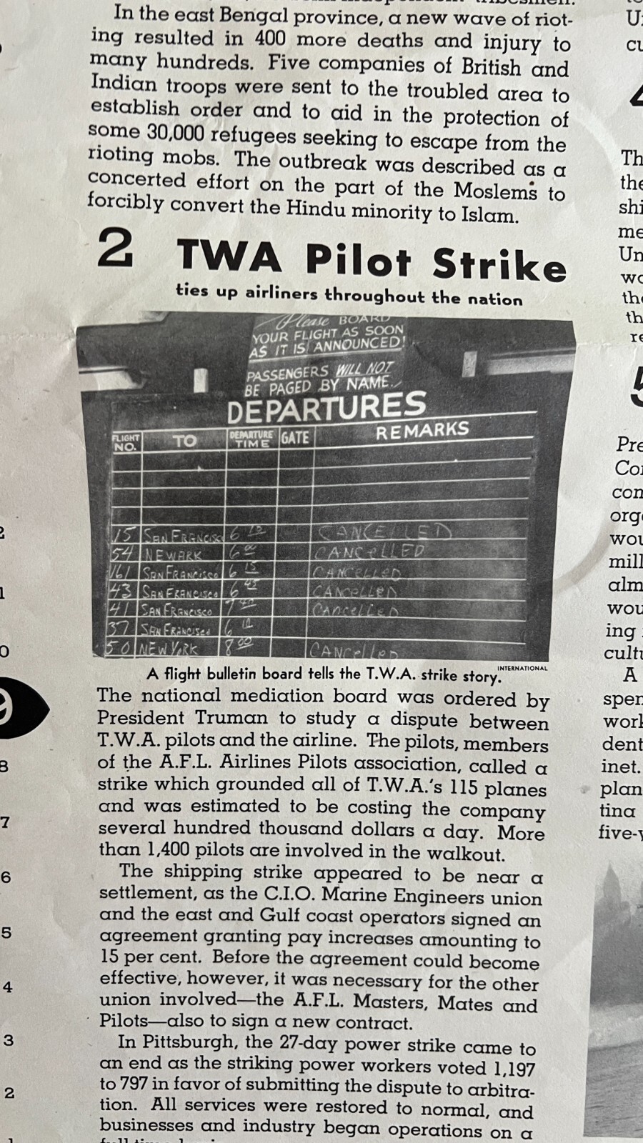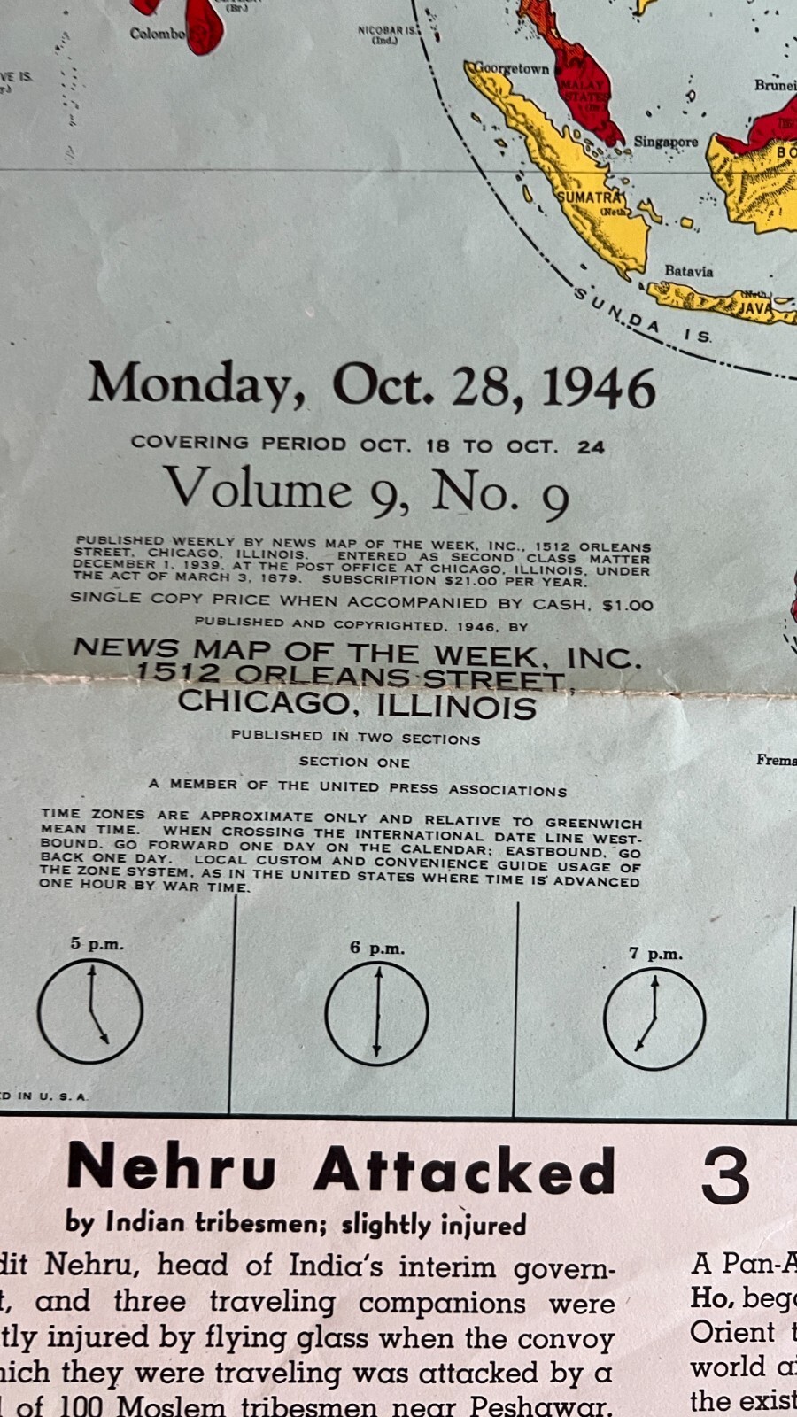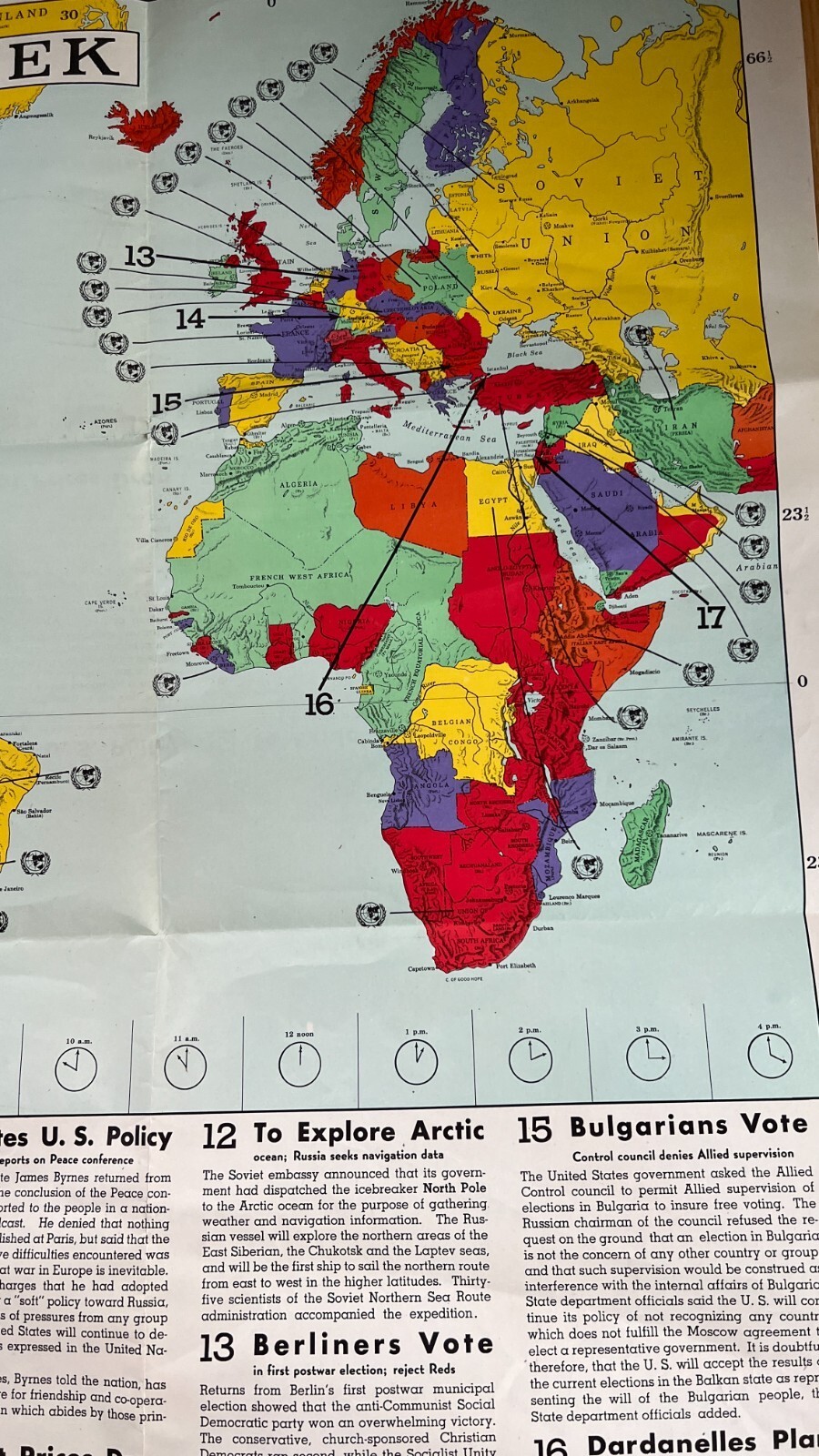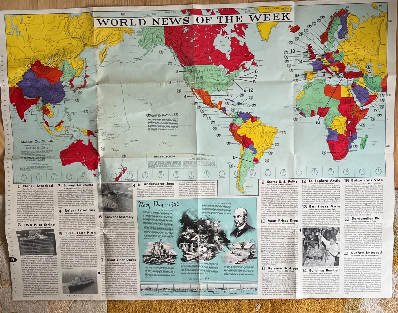 1946 United Nations World News Map Colorful 35"x 47" Vintage TWA Strike + More