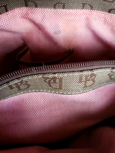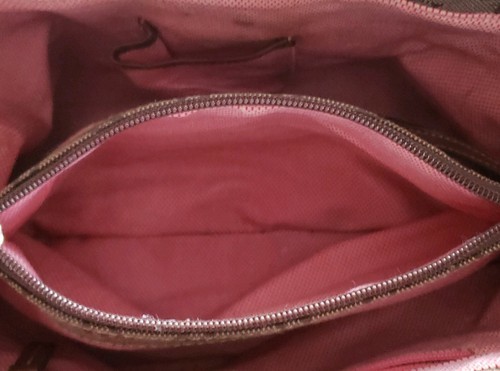 Interior has 1 side ~ open pocket ~1 side zipper pocket ~ 1 center zipper pocket