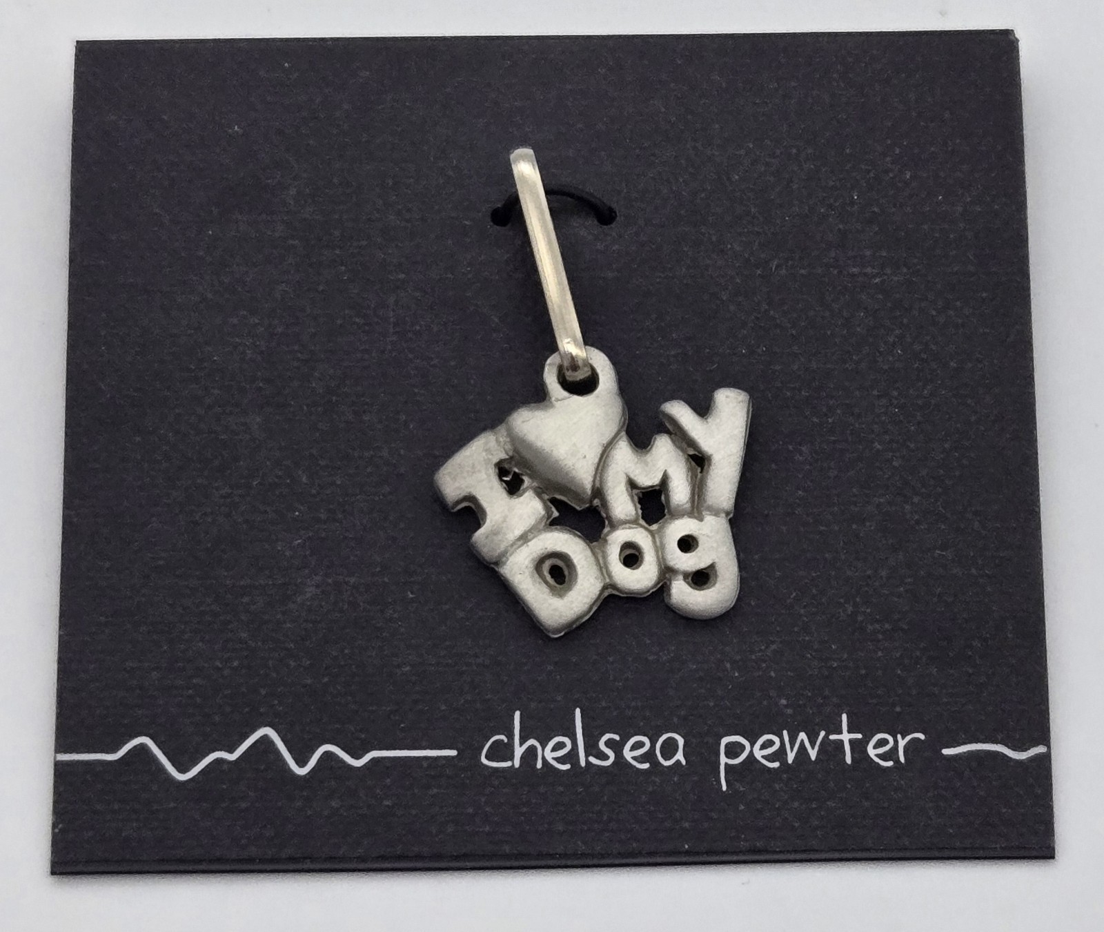 Show your love for dogs with this charming Chelsea Pewter ?I ?? My Dog? piece?perfect for attaching to a bracelet, necklace, or keychain as a subtle and heartfelt accent.