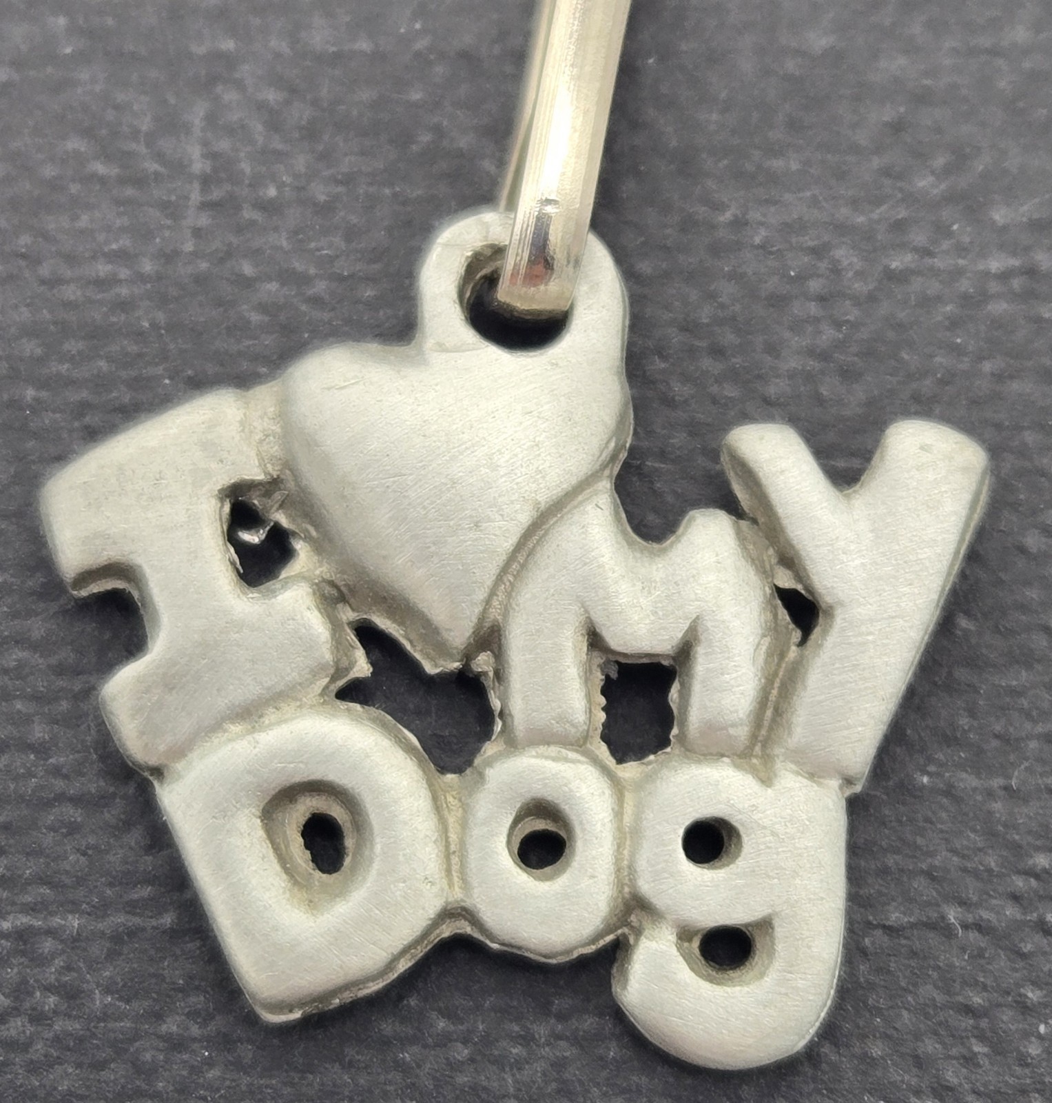? Features raised ?I ?? My Dog? design with classic pewter tone