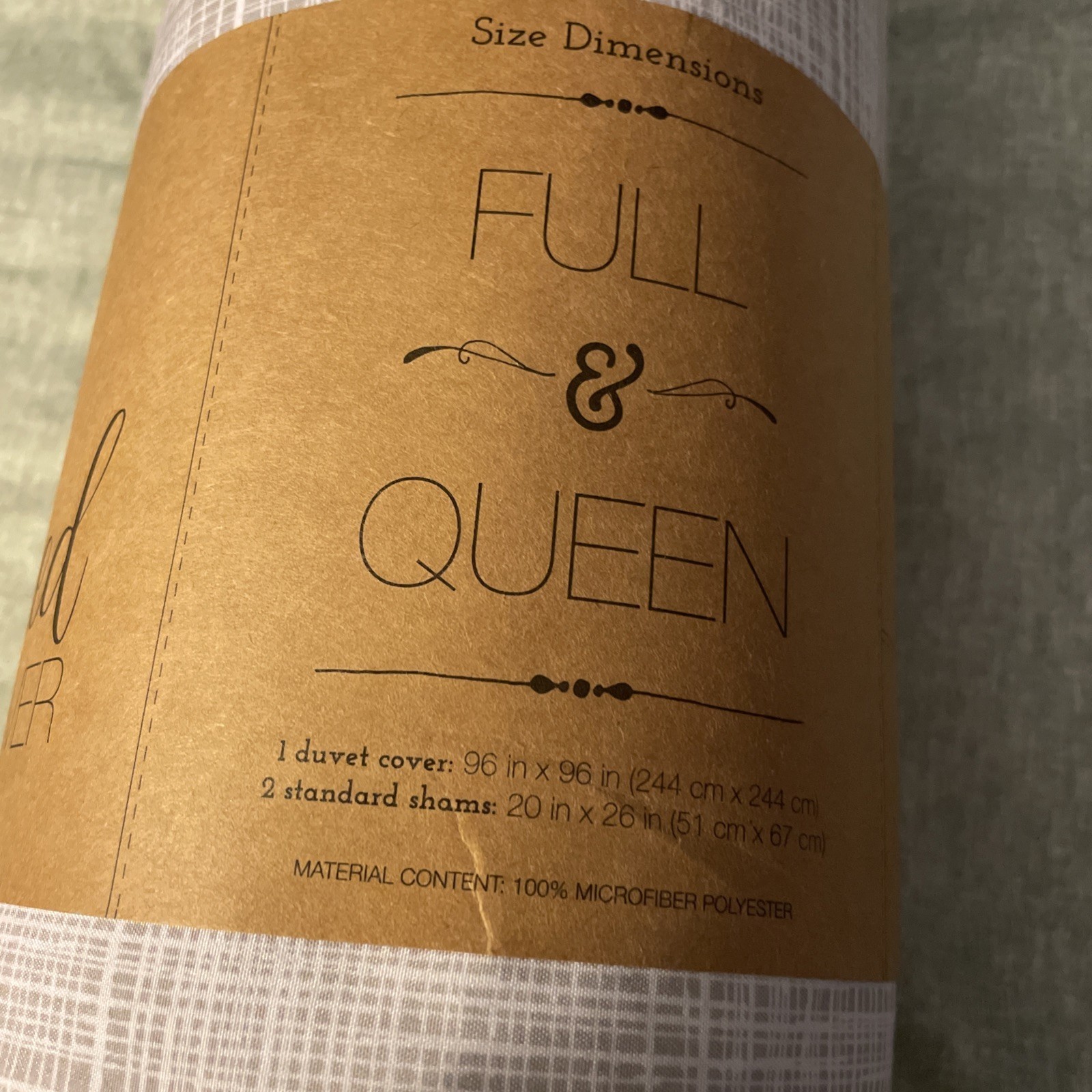 Brand New patterned duvet cover and shams. Fits Full/Queen size bed and standard pillows. Tan/White checked pattern.