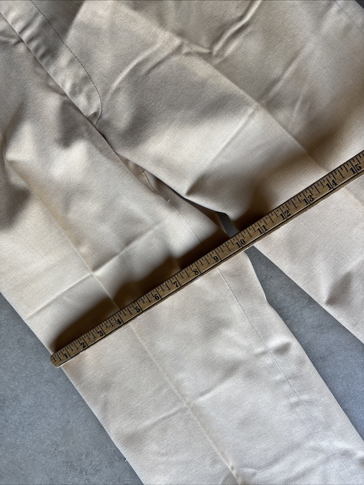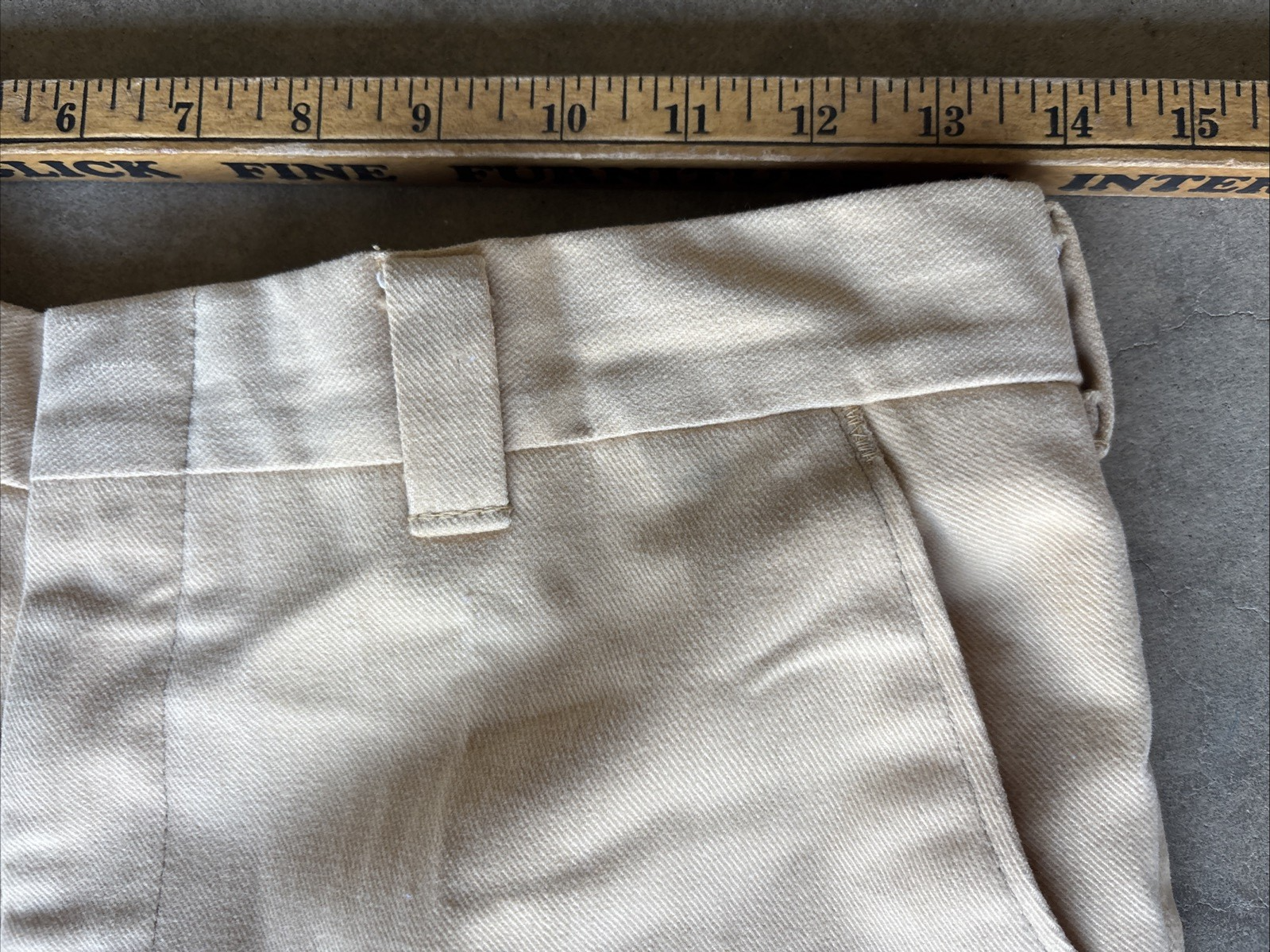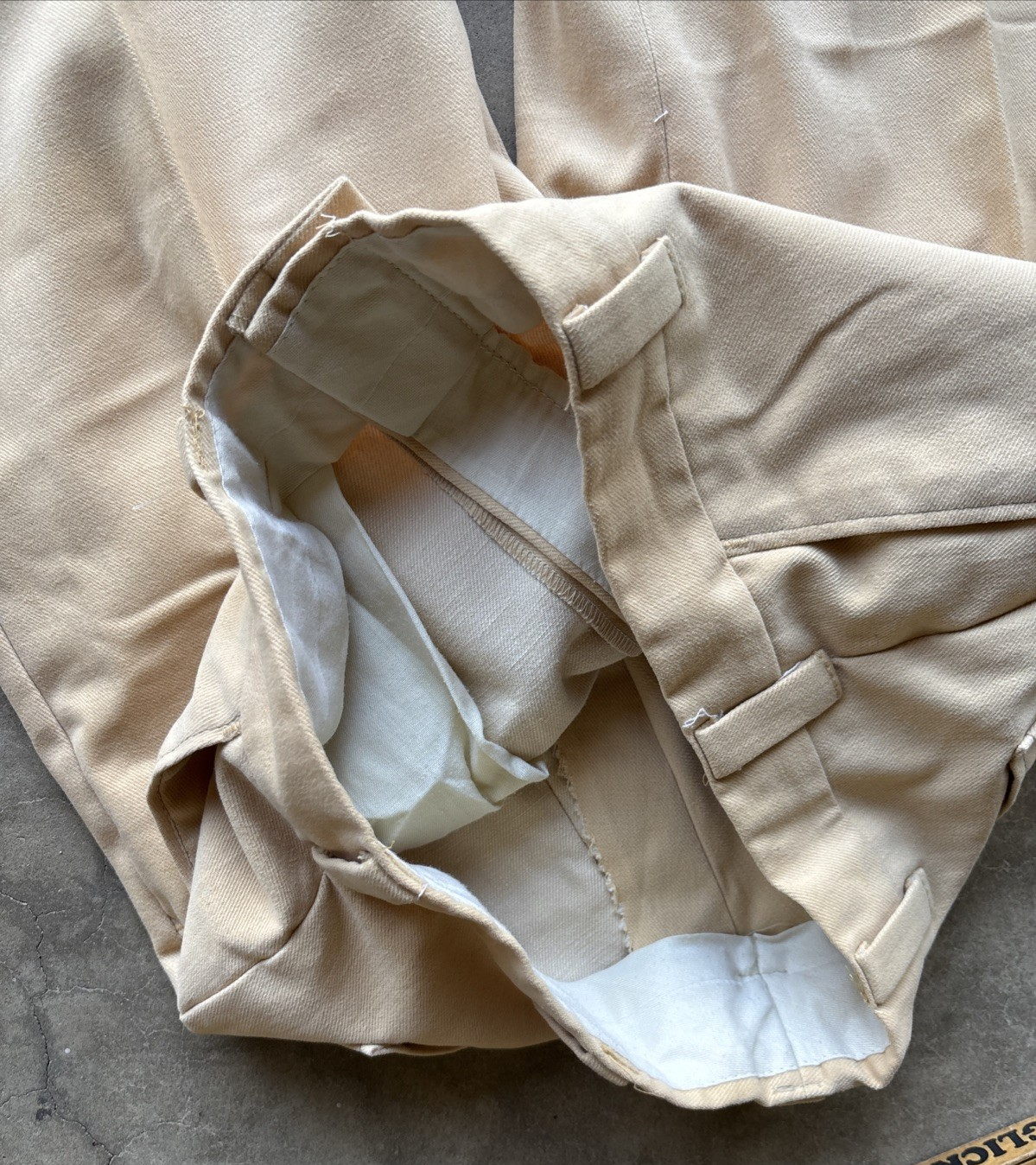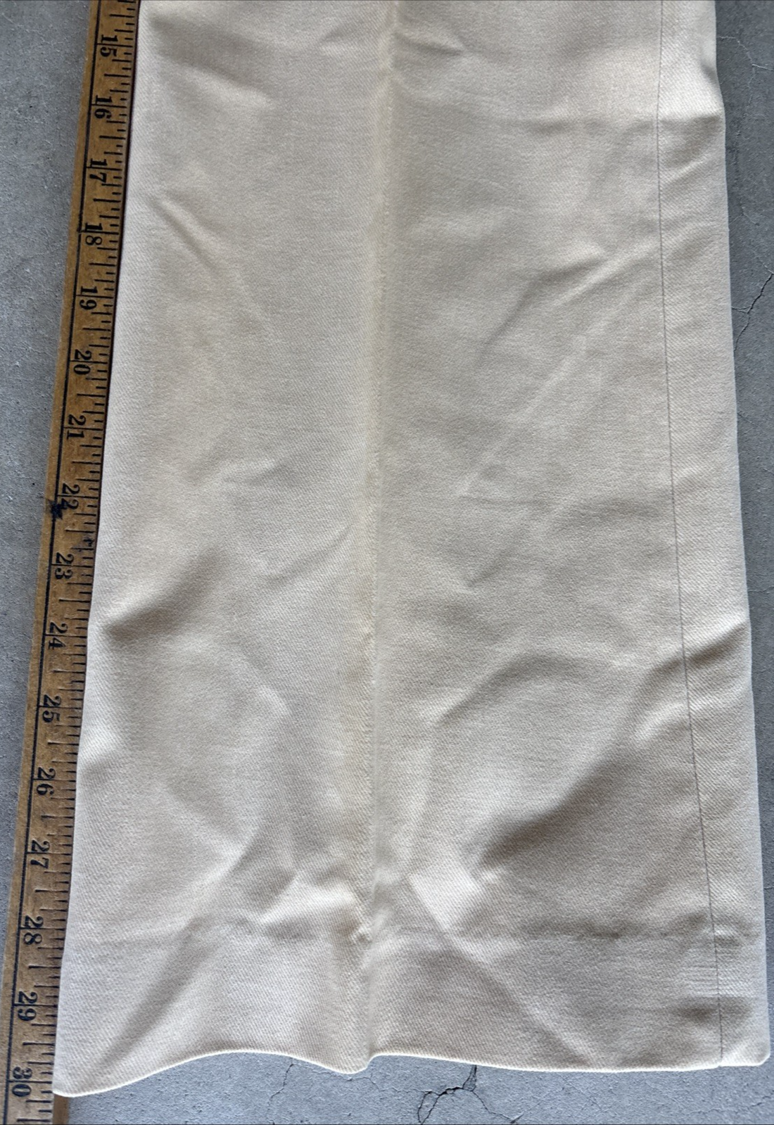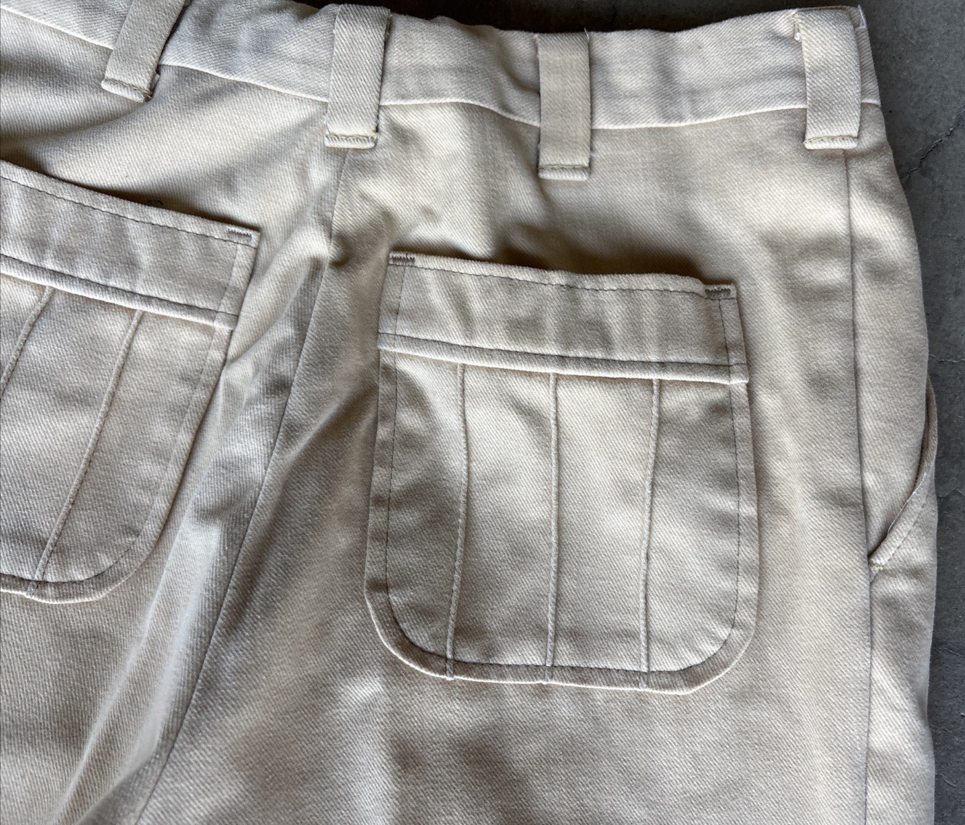 These vintage 70s Bell Bottom Pants by Tobias Kotzin are perfect for a casual occasion with their cream color and wide flare leg style. Made from cotton, these original pants have a 30-inch inseam and a men's 28-inch waist size, ideal for a retro disco look reminiscent of Saturday Night Fever. Manufactured in the United States, these pants capture the essence of 70s fashion with a nod to the era's boogie nights and dazed and confused vibe. Perfect for adding a touch of nostalgia to any outfit.