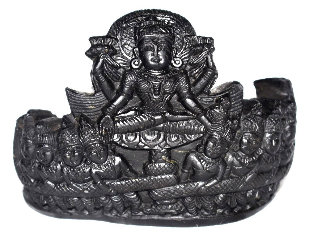 The Samudra Manthan idol Carved Beautifully on Natural Golden Sudarshan Shaligram of Nepal . In this idol Goddess Laxmi showing emerges from Samudra Manthan during the churning of the ocean of milk (ShirSagara) , Goddess Laxmi having four hands in which two holding the lotus , one holding the Kalash and fourth one in Varada Mudra can be seen on the top of Mount Mandara , which was used as the churning rod . Vasuki the king of Serpants, who abides on Shiva?s neck, became the churning rope can clearly seen was hold from the head side by demons in a panel , and tail side was hold by Lord vishnu , Lord Brahma , lord shiva .