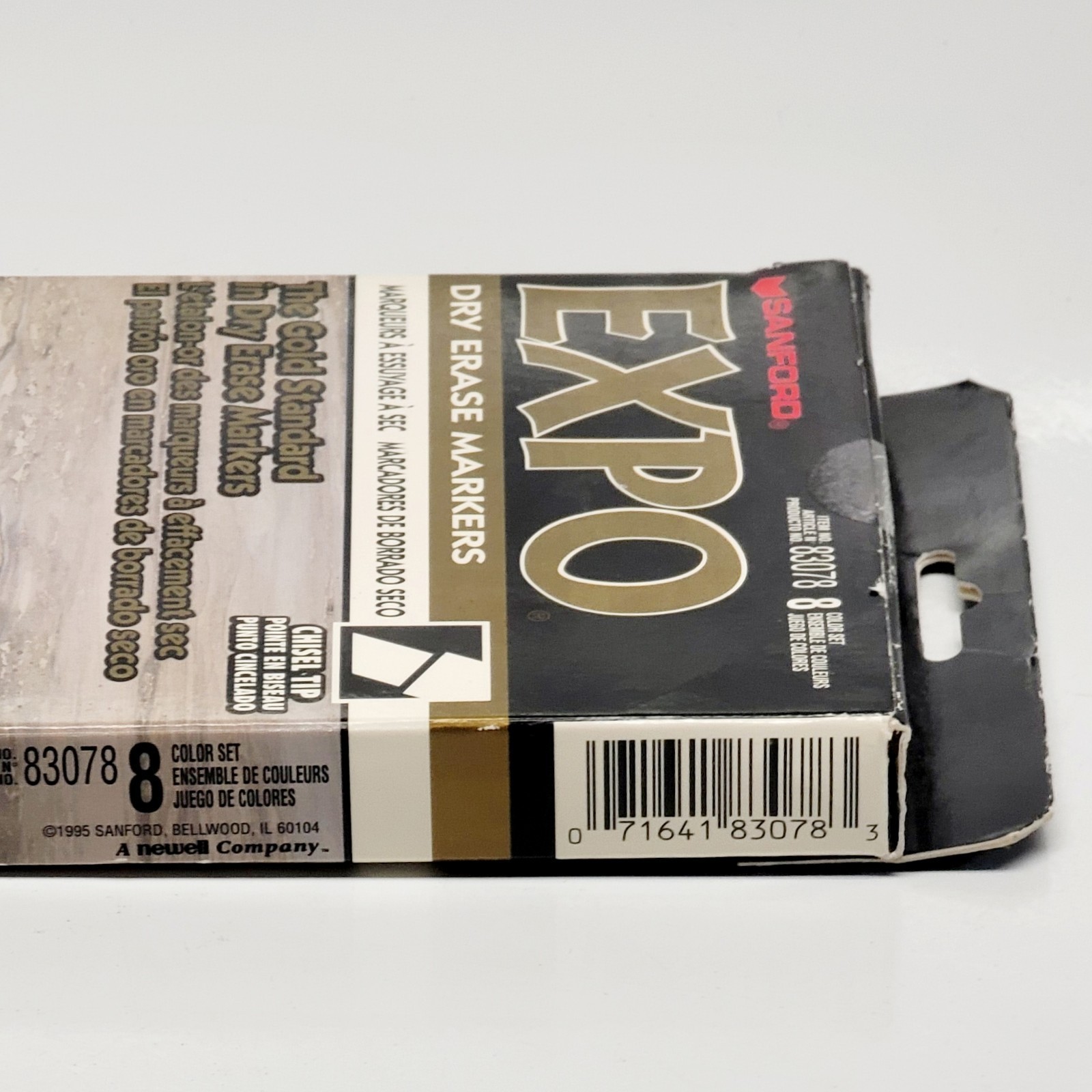 The product is a set of 8 vintage Sanford Expo dry erase markers with chisel tip, manufactured in the United States in 1995. The markers come in a mix of colors and are new old stock, making them a rare find for collectors or those looking for unique office supplies. The Expo brand is known for its quality products, and these markers are a vintage piece that offers a touch of nostalgia to any workspace.