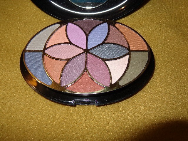 Includes one eyeshadow palette, one blush palette, one lipstick palette, 2 shades of face powder, one tiny black eye pencil, one tiny red lip liner, one tiny blush brush, and one pencil sharpener. Two slots are empty- there may have been other applicators in there but they are now missing. This has a round mirror under the lid. There are a few accidental smudges on the products, but nothing has ever been used. Case measures approximately 6 inches by 4.5 inches.