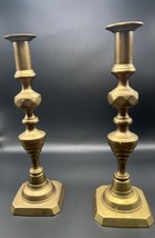 These wonderful candle sticks are about 11? tall and 4? at the base. Vintage brass. In very good condition, but they are used. Push up sticks to remove spent candles.