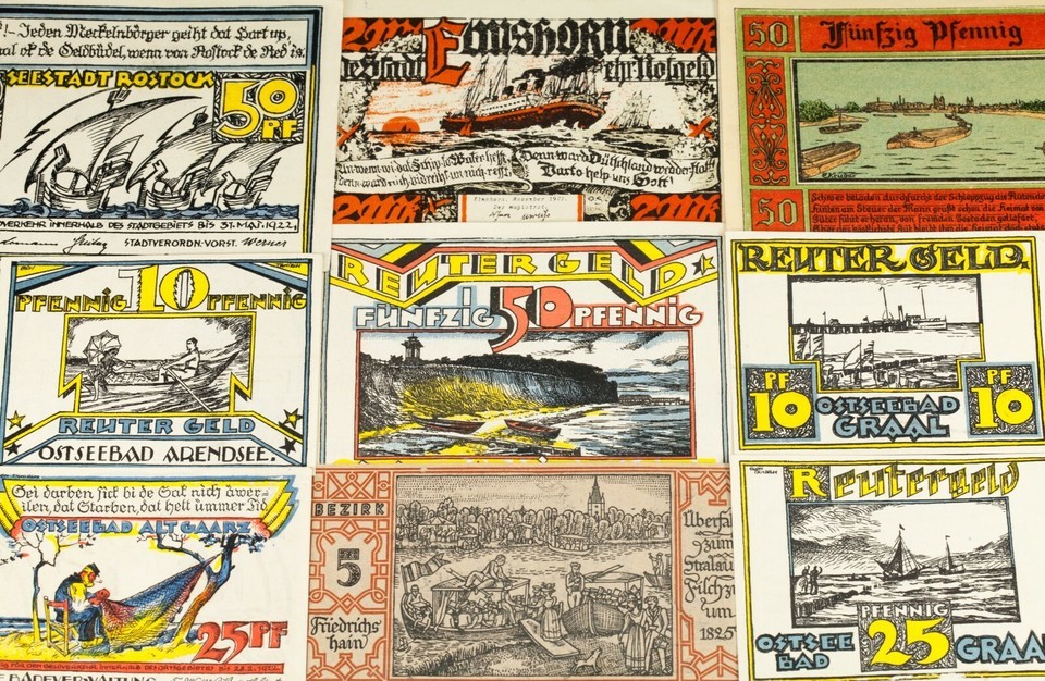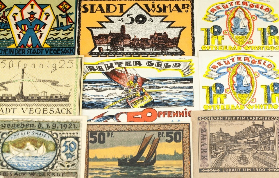 Ce lot comprendra 25 notes de notgeld individuelles d'Allemagne apres la Premiere Guerre mondiale. Valeurs faciales entre 5 pfennig a 5 marque. Theme nautique; navires et bateaux.