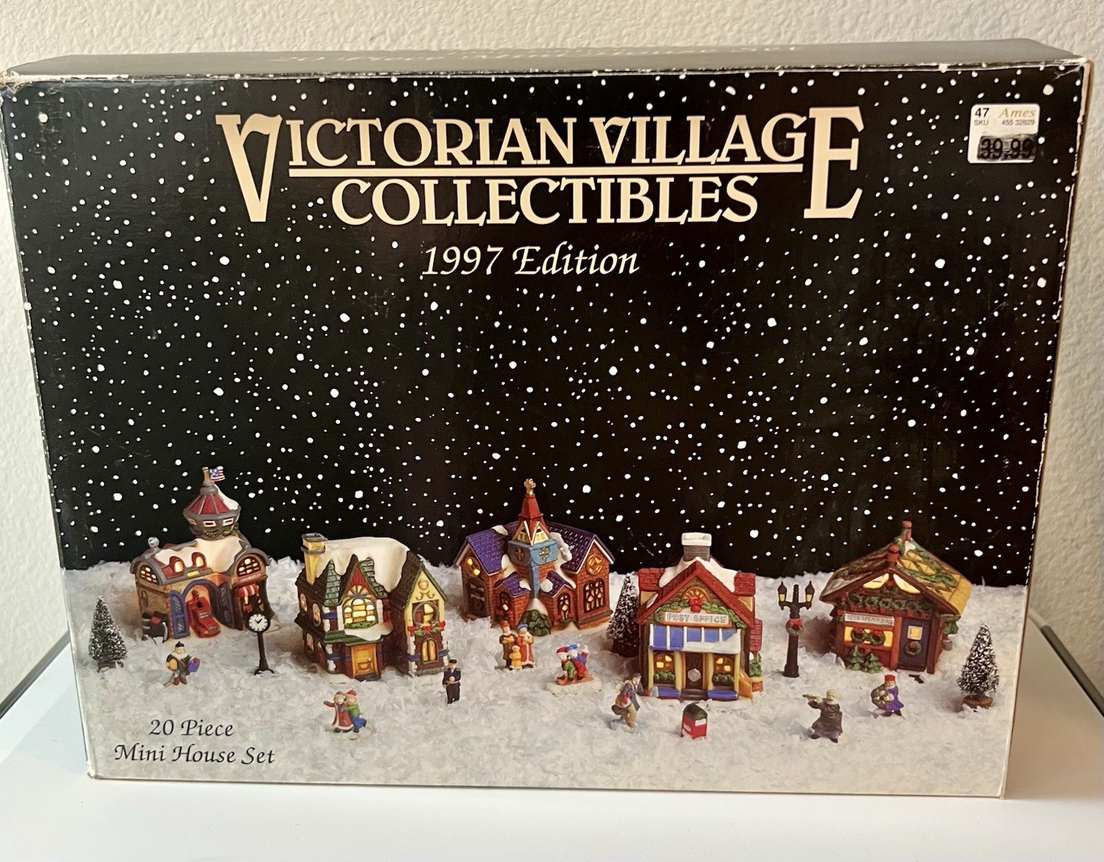 For collectors of vintage holiday decor, this is the Victorian Village Collectibles 1997 Edition Mini House Set. These sets are becoming harder to find, especially in mostly complete condition.