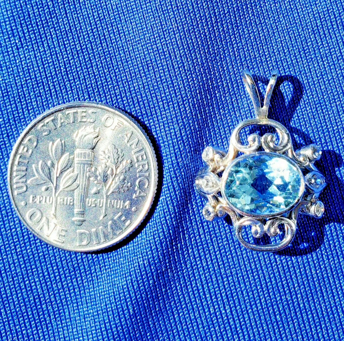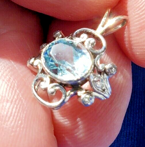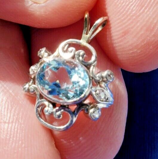 Aquamarine Diamond Pendant Deco Gift Hand made Medallion 14k White Gold Charm