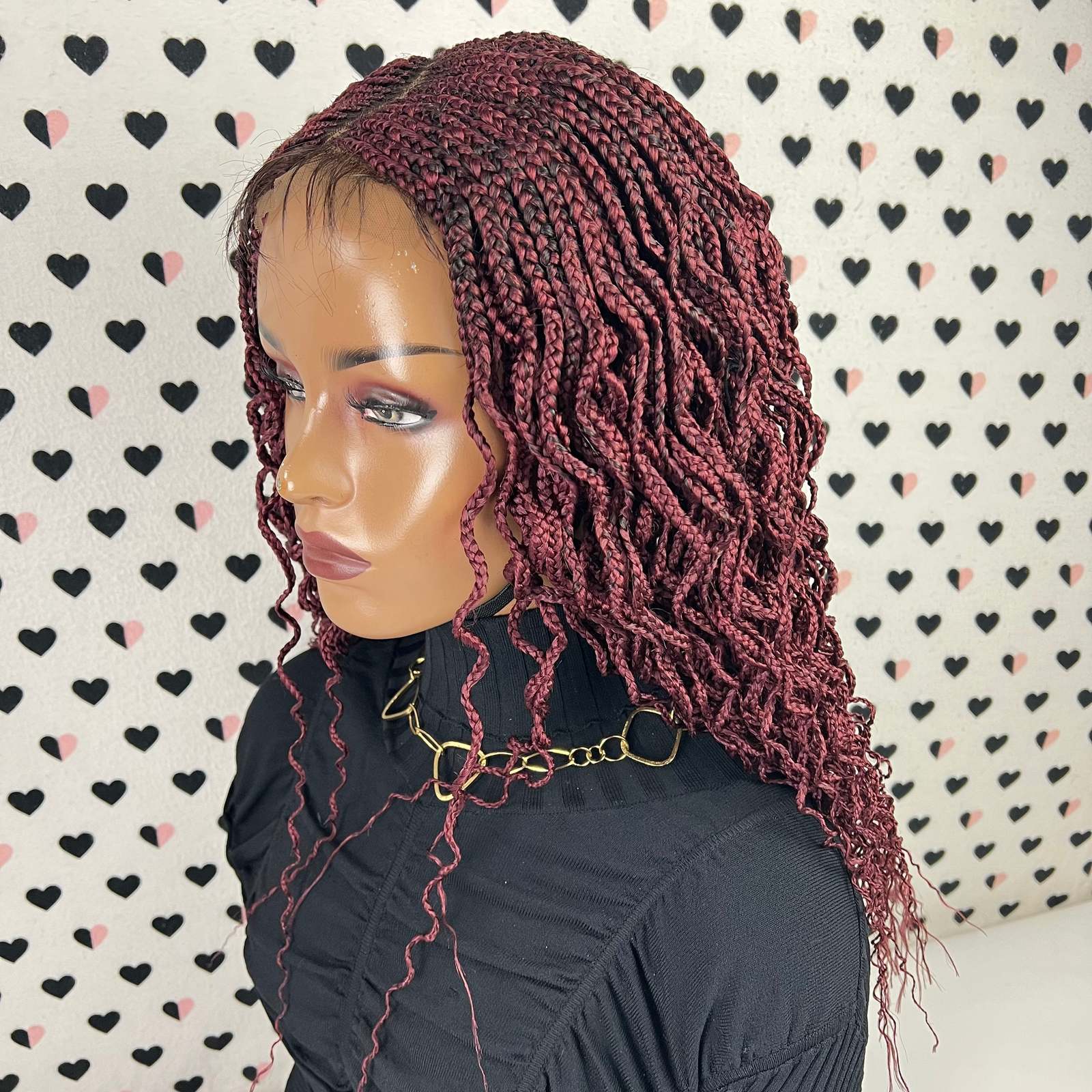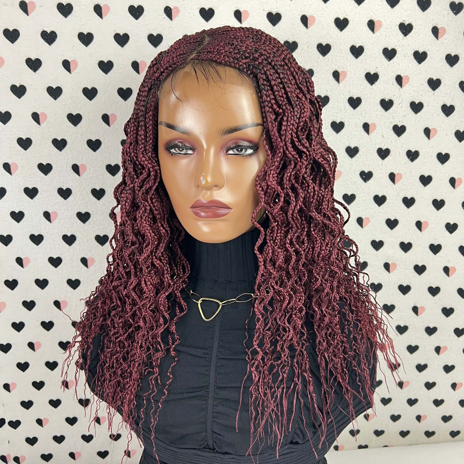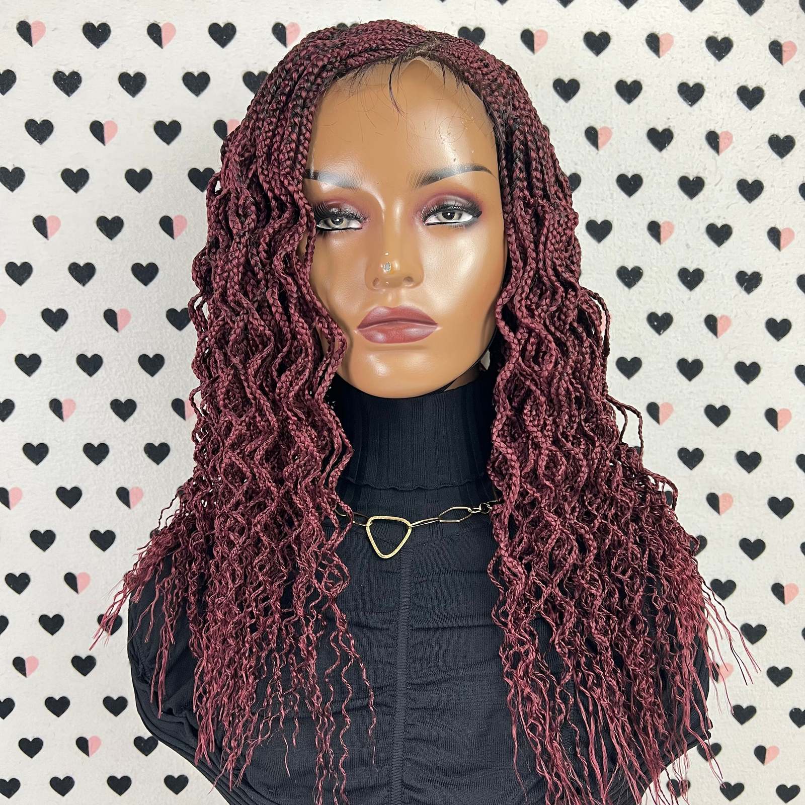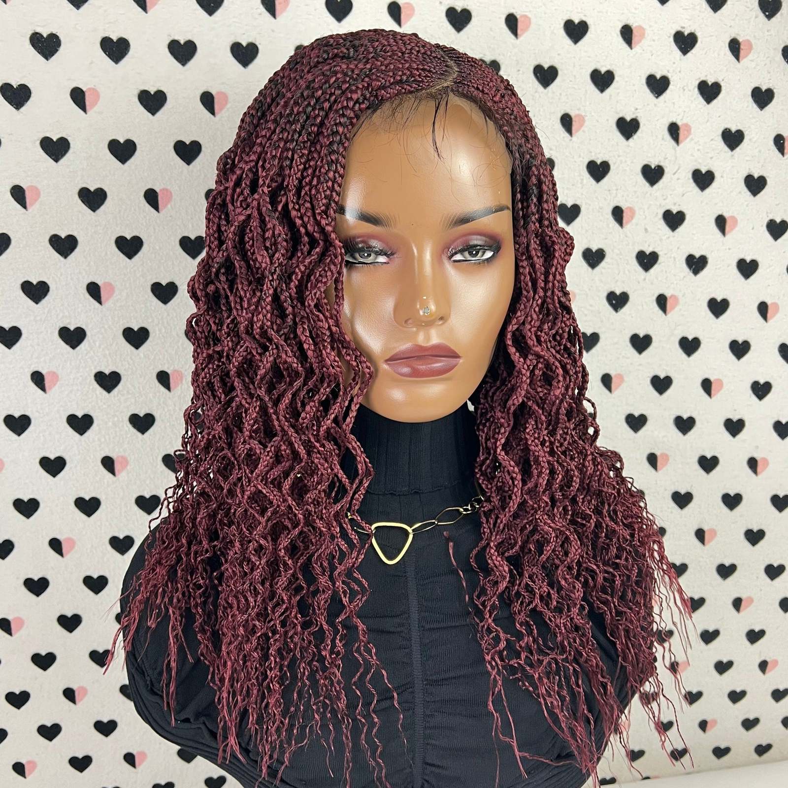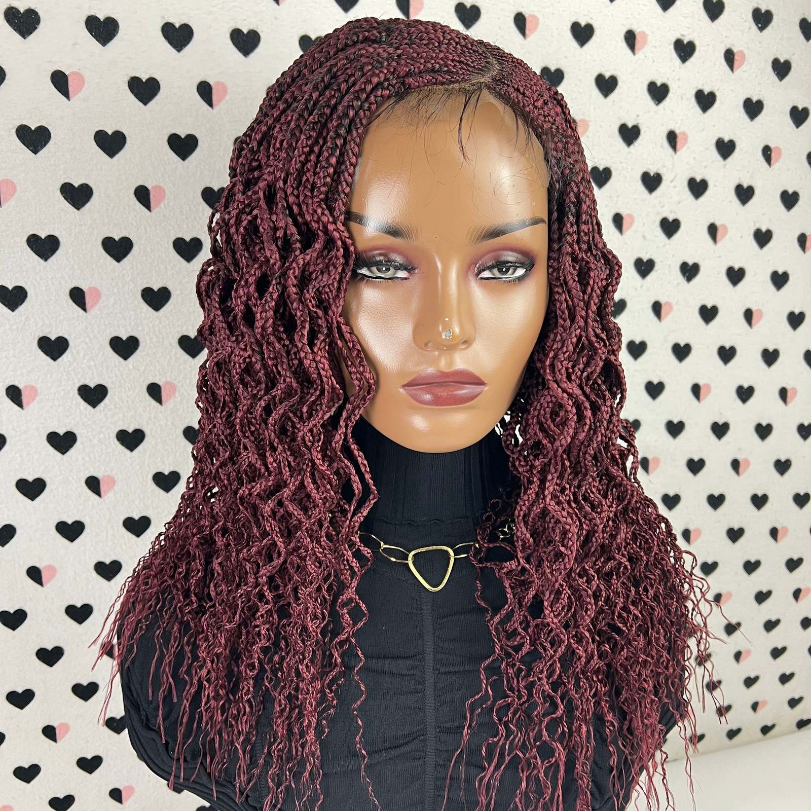 Fully hand braided handmade goddess box braids lace front wig with curly ends.