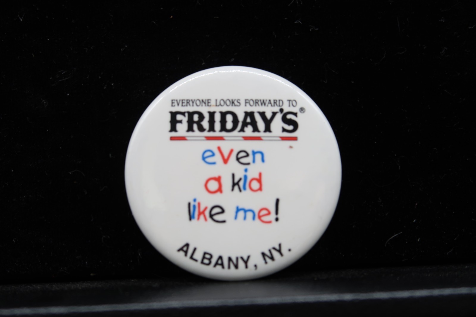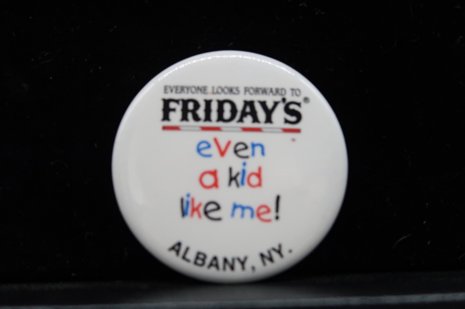 Vtg Fridays Button Pin Everyone Looks Forward To Even A Kid Like Me Albany NY