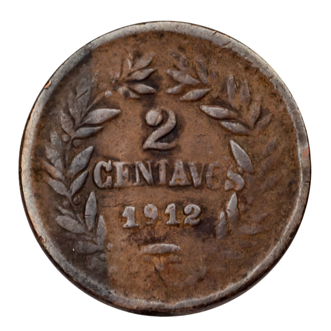 1912 Honduras 2 Centavos Bronze Coin KM #69 Very Fine Condition