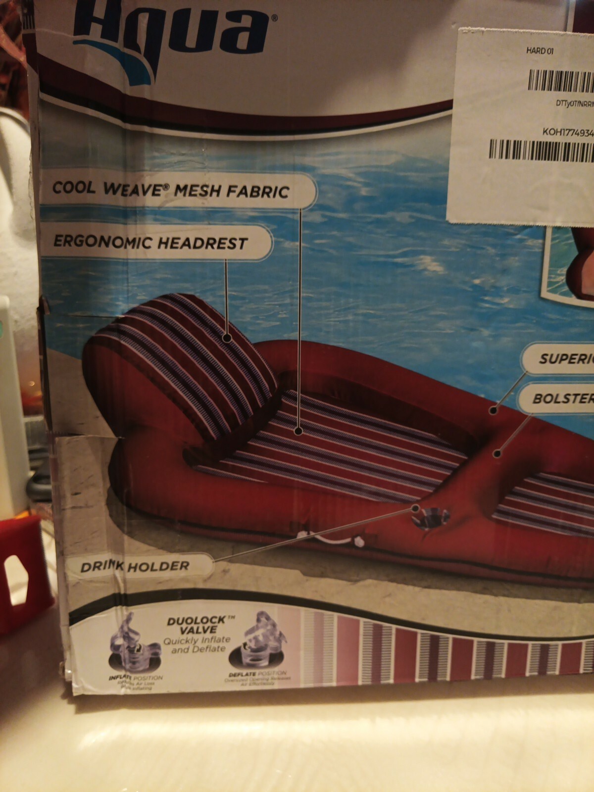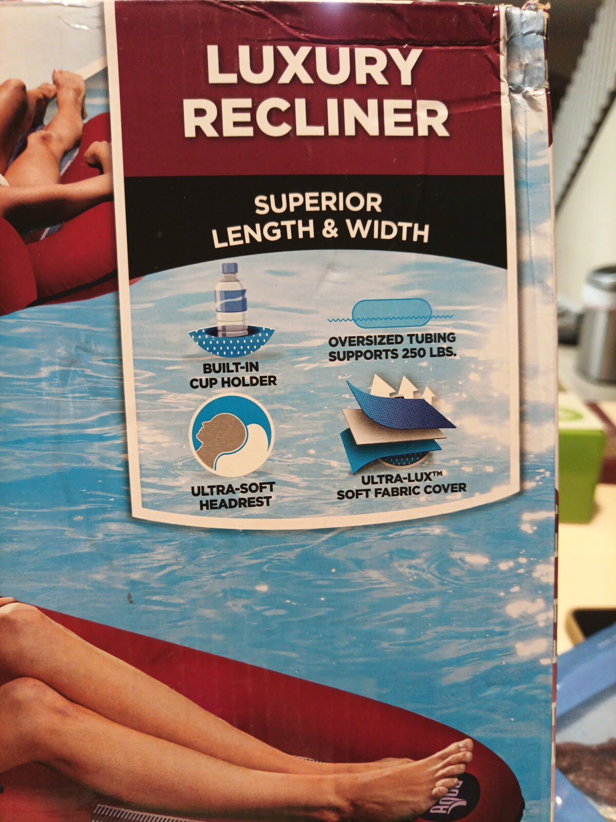 The Aqua Luxury Water Pool Lounge in Navy/Light Blue is an extra-large luxury recliner designed for adults. This spacious inflatable pool lounge features a mesh material for comfortable seating and has a weight limit of 250 pounds. The stylish XL lounge in blue color is perfect for relaxing in the water and is recommended for individuals aged 10 to 100 years old. With a retractable footrest for added comfort and a 4.4 out of 5 stars customer rating, this luxury recliner lounge from Aqua Leisure is a top choice for outdoor relaxation. Box is dented
