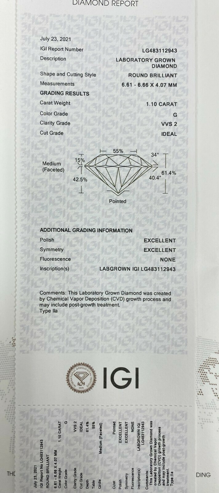 · 1.10 Ct Round Cut CVD Diamond G Color VVS2 Clarity