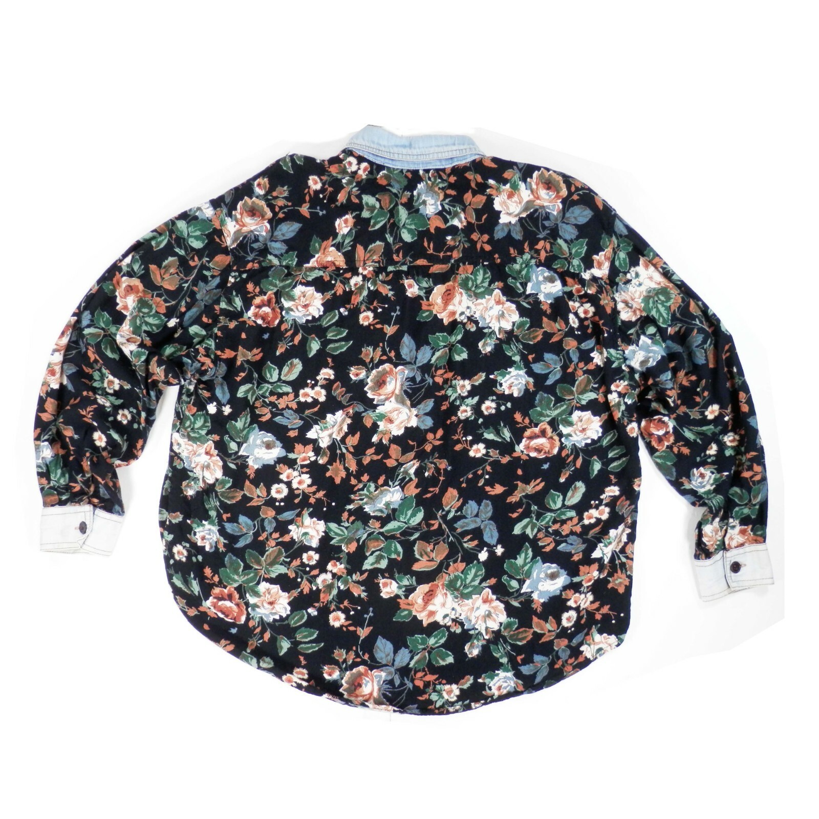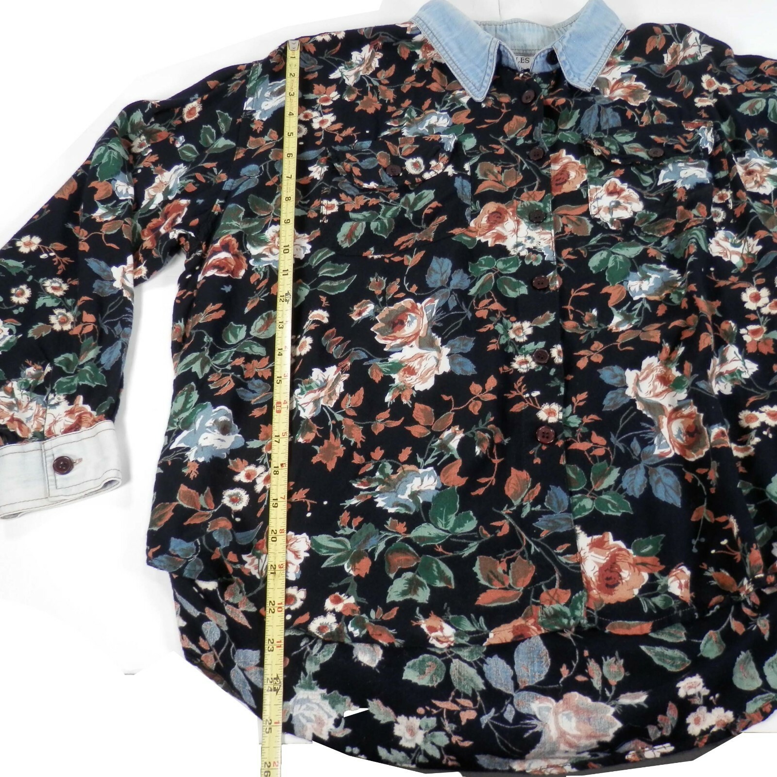 Vtg 80s 90s M Grunge Floral Boxy Button Down Shirt Denim Cuff Riot Grrl Top