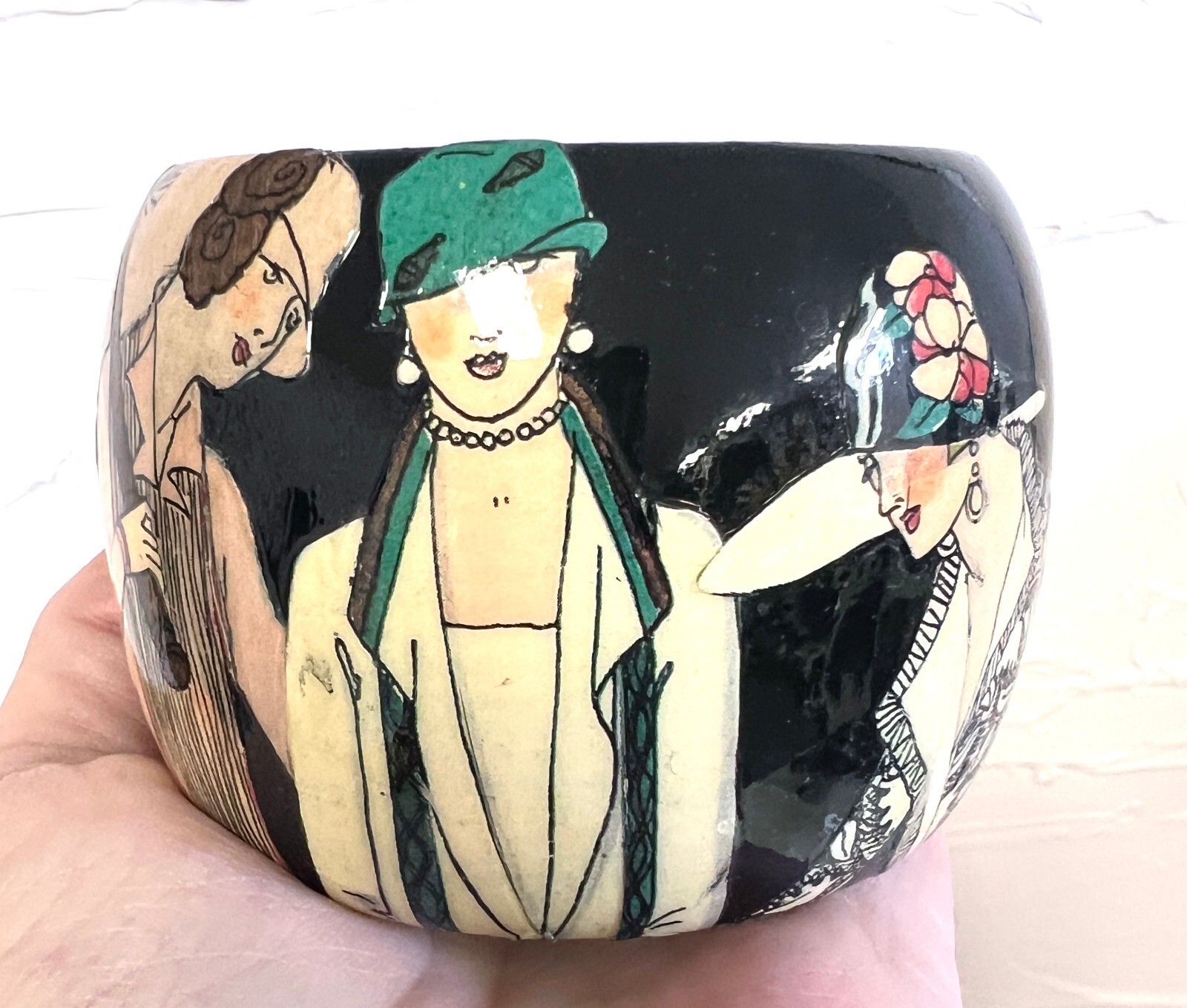 This gorgeous one of a kind decoupage? Handpainted? I cannot decide, but it IS simply beautiful. I can't find any info on the artist( it is signed inside " Mar San or Marsan") - it seems like it is enameled on the outside and there's even half a woman's body on the inside of the bracelet-- HOW???? Also, could be a 70s-80s replica of 1920s. Sorry I don't know more.