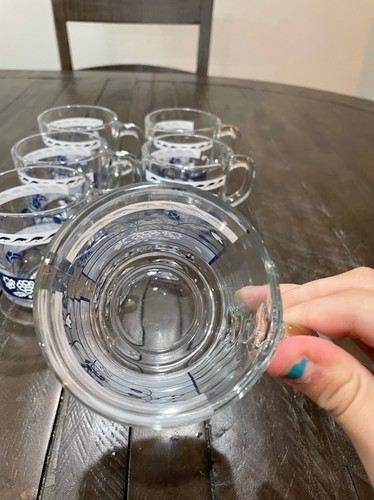 Anchor Hocking Clear Glass Blue Old Blue Onion Floral Scene Mugs Set Of 6 MCM.