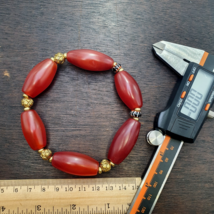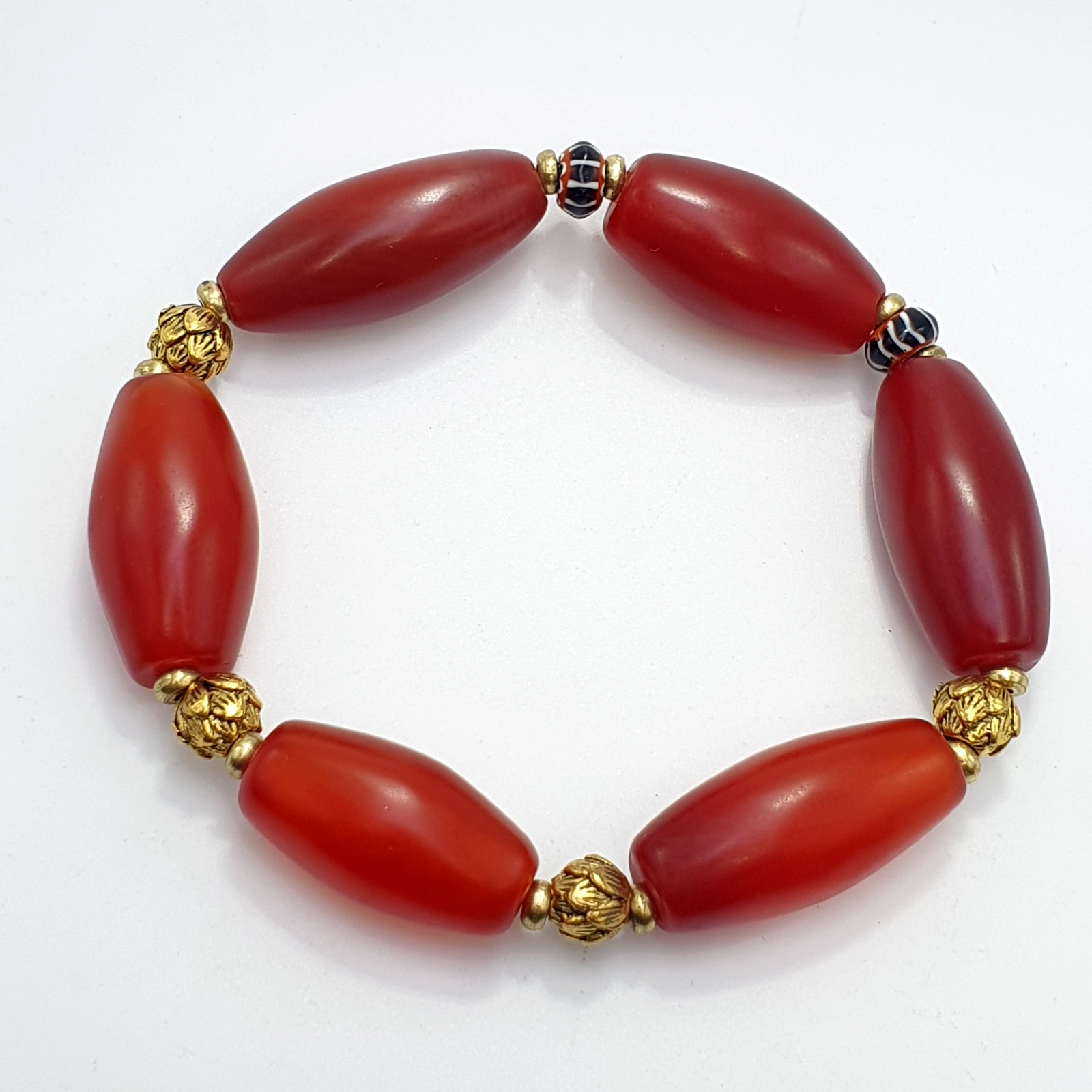 this bracelet is a stunner. those elongated red agate beads paired with ornate gold-toned and striped spacers give it a bold, spiritual elegance that?s deeply rooted in Himalayan design traditions. These beads often referred to as carnelian agate in Tibetan and Nepalese traditions are prized not just for their rich, earthy hues but also for their spiritual symbolism.