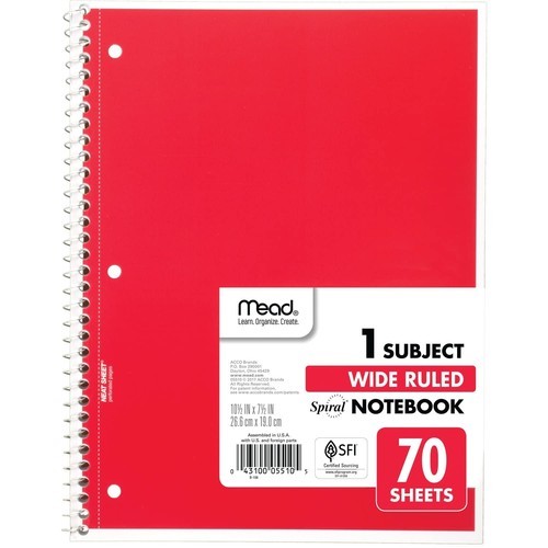 Mead Spiral 1 Subject Notebook is versatile and is ideal for a variety of uses including in-class assignments and homework. Perfect to use for 1 subject, this spiral notebook comes in handy for your favorite class or any project. With 70 wide ruled, double-sided sheets, there?s plenty of notetaking space. Wide ruling is ideal for the younger student who needs more space between lines. Sheets measure 10-1/2" x 7-1/2" when torn out with an overall size of 10-1/2" x 8". Perforation easily tears out with clean edges. Notebook is 3-hole punched to store in your favorite binder. Covers are coated for durability. Available in Red. Crafted with pride and assembled in the U.S.A.
