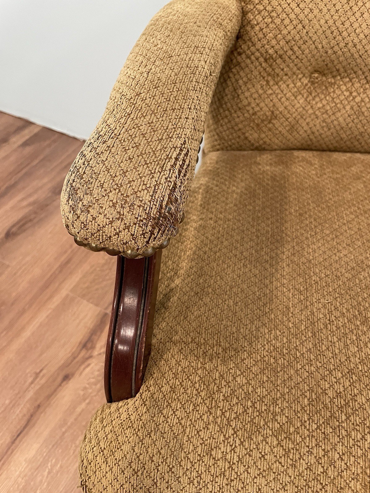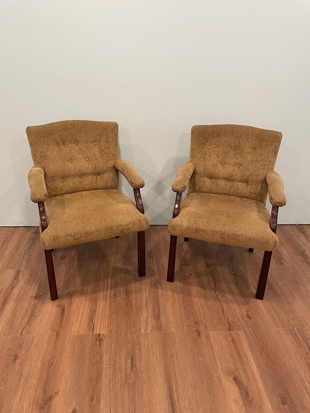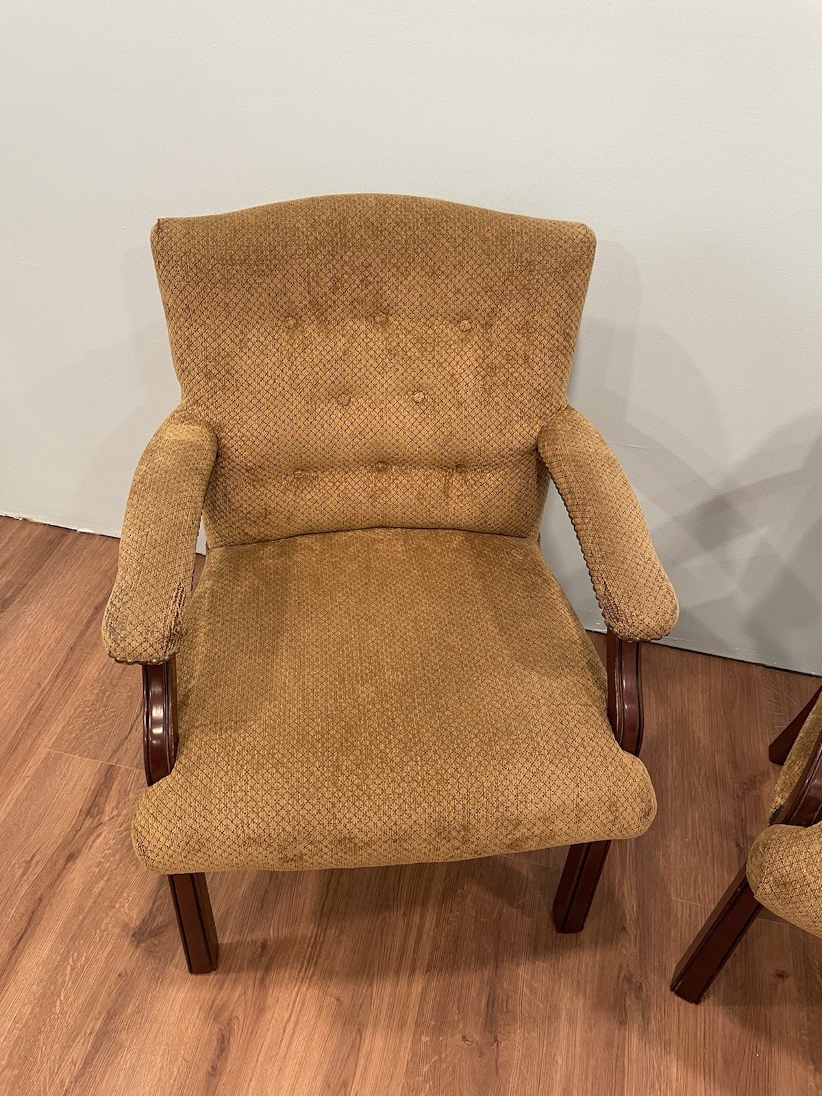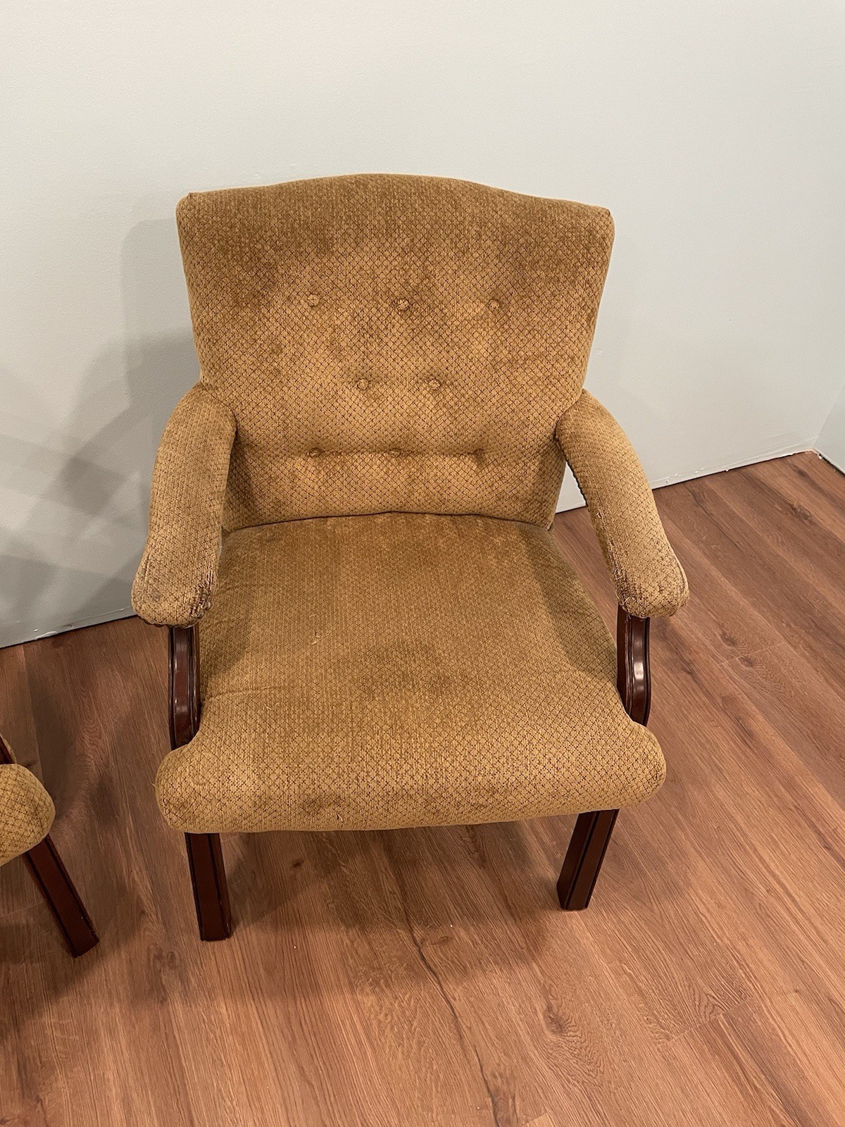 For sale is a set of 2 matching yellow fabric chairs. The chairs have some very minor edge wear to a couple of arms as shown. Very solid construction.