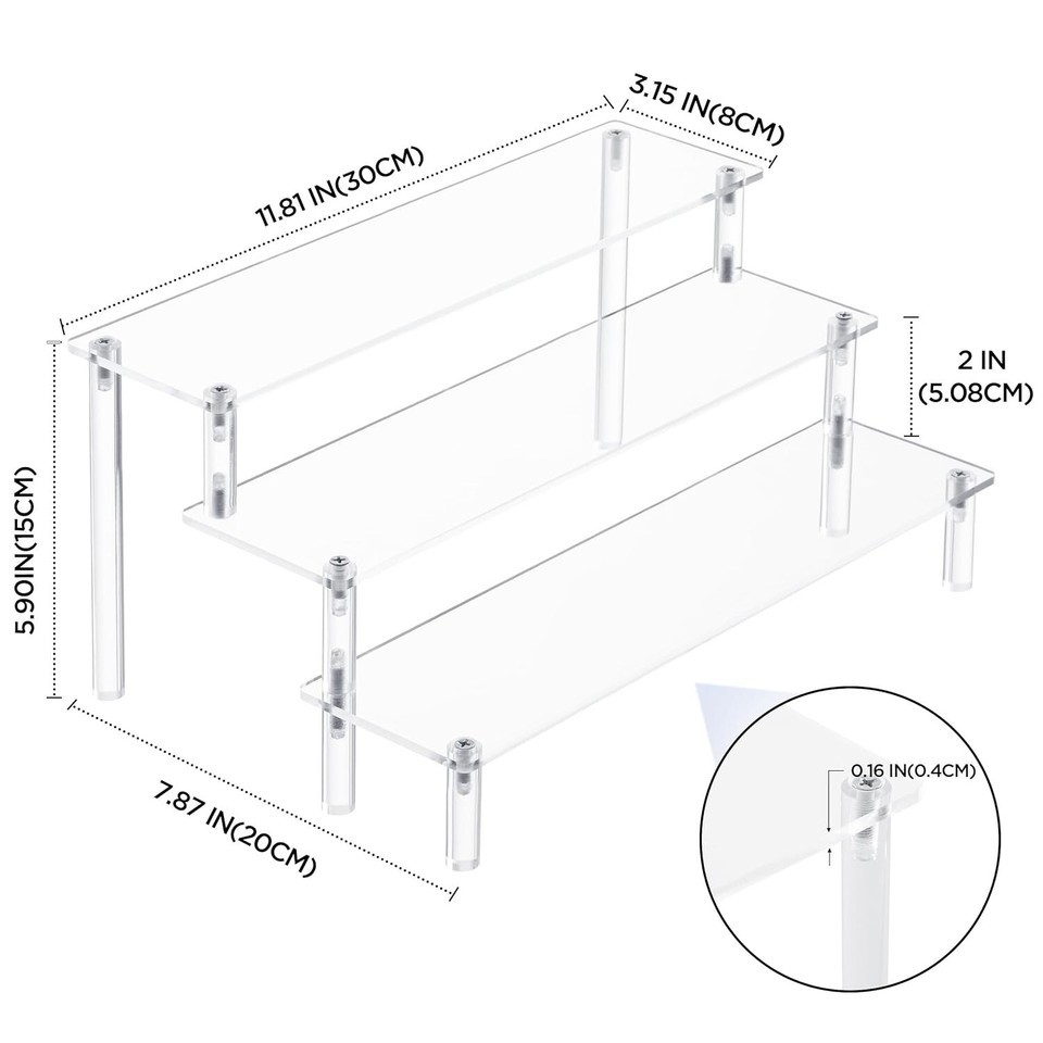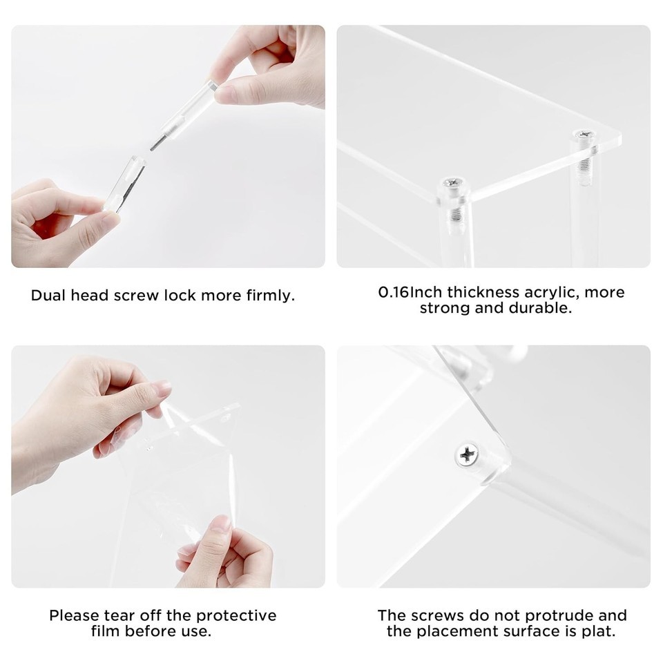 ?Size Quality Package?Every acrylic panel is 11.81" long and 3.15" wide, the height of each tier is 2", the total height is 5.9". All items are individually wrapped in a protective bubble film to prevent scratching and rubbing.there are protective film on the both side of acrylic board, please peel it off before using.