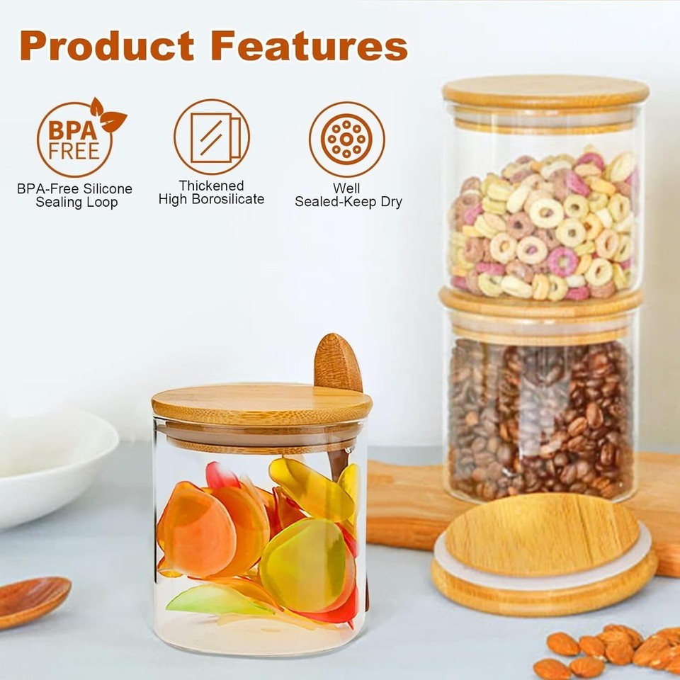 ?WIDE APPLICATIONS? The glass kitchen canisters for pantry organization and storage are suitable for storing various dried ingredients to retain their freshness, such as oatmeal, cookie, nuts, beans, candy, snack, spices, and tea. With clear glass jars, you can easily see inside and quickly find the ingredients you need.