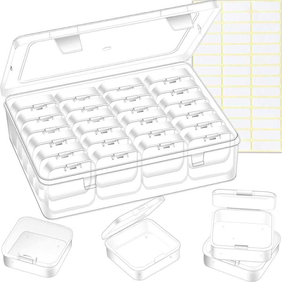 PACKAGE INCLUDE: You will get 1 large plastic organizer box, 28 small storage containers with lids, and 1 sheet label to mark the product category. All plastic boxes are transparent, so you can easily find what you need. Each storage container has a hinged lid that is tightly sealed and easy to open, ensuring that stored items do not get dirty or spill out