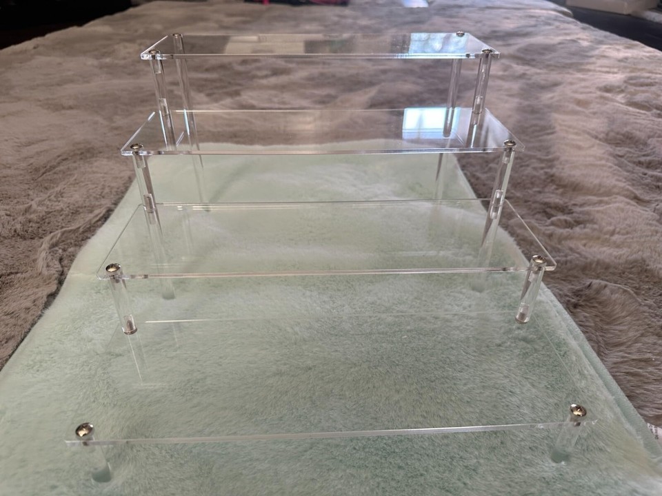 Sturdy and Durable: This acrylic risers is made of high-quality acrylic, transparent and not easily damaged. The acrylic display shelf is equipped with a soft cleaning cloth to help you easily keep them clean.