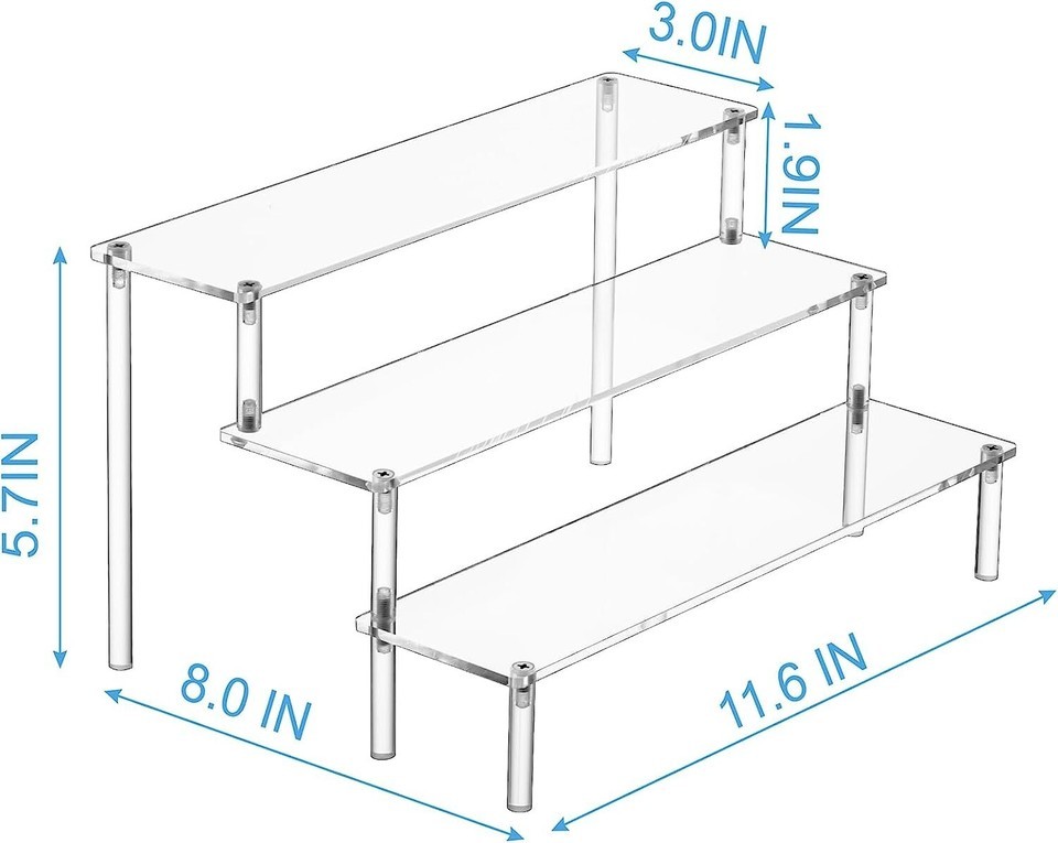 ??Display More Things? SIZE: Every acrylic panel is 11.6IN long and 3.0IN wide, the height of each tier is 1.9IN, the total height is 5.7IN. 3 tier cupcake stand is simple design and durable. Acrylic cupcake stand 3 tier features 3 layers that provides enough space to cologne perfume, cosmetic, skincare lotion, Amiibo Funko POP Figure, dessert, cupcake risers, collectibles and etc.