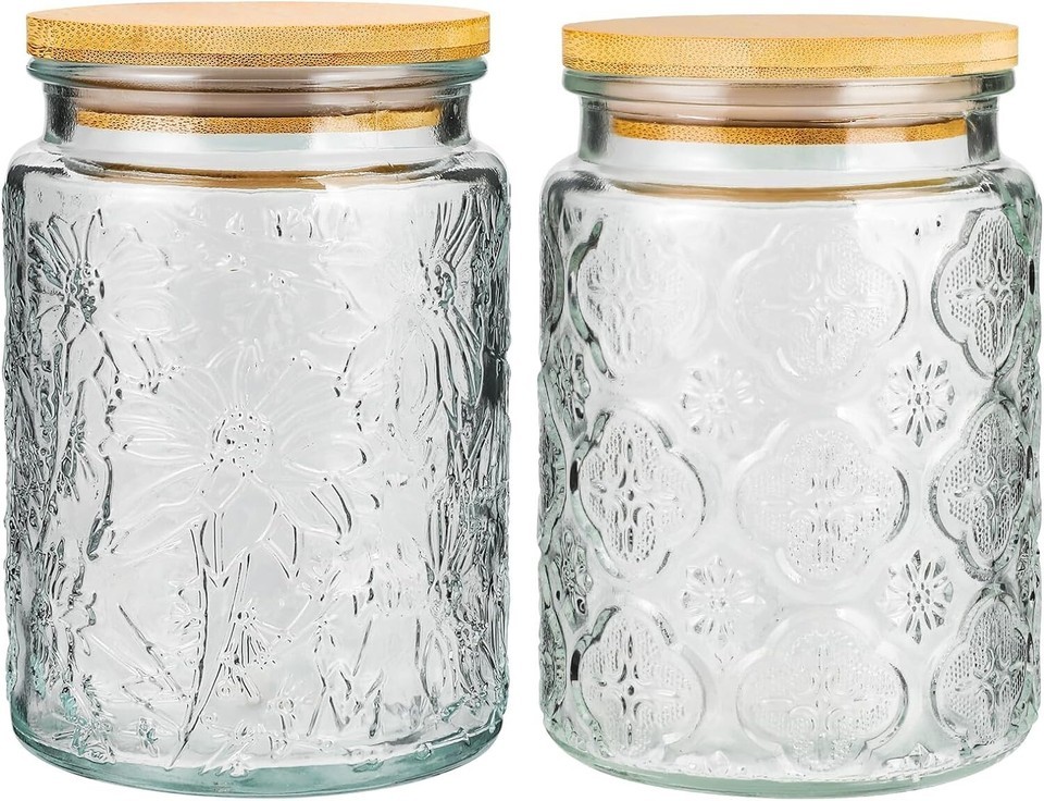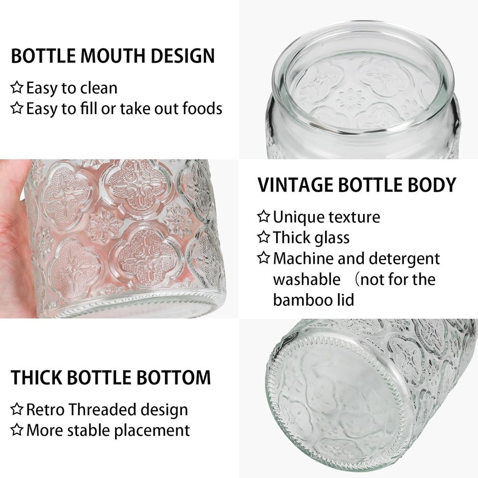 Airtight Glass Containers: These food containers have PP gaskets around the bamboo lids to seal against moisture and keep food dry and fresh for a long time. The unique vintage embossed texture makes them decorative and attractive, a perfect addition to your kitchen pantry.