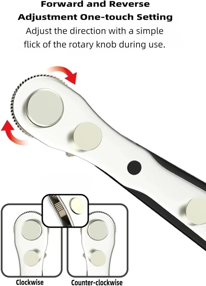 Ratchet construction features: Featuring a 36-tooth ratchet system, First 15 tilt angle design for increased down force. the direction of tightening or loosening screws can be changed with a simple push. Tail innovative design, increase the tail screwdriver bits interface, can be operated vertically, like having multiple different models of screwdrivers. The bit adapters on the ratchets are magnetic and hold the any 1/4" hex bit firmly in place, ensuring a stable working position.